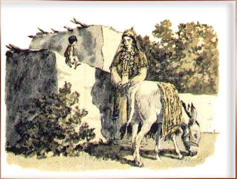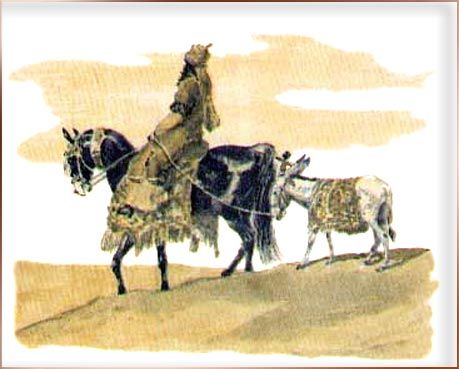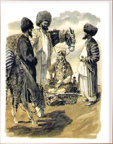 И разбойник положил саблю к ногам красавицы. Но тут выступил вперёд третий. Он с презрением взглянул на товарищей и хвастливо сказал: — Поглядите, что я принёс! Я побывал в ханском дворце. По верёвочной лестнице я пробрался в окошко ханской бани и, пока хан мылся, унёс у него чалму. Так сказал третий разбойник и положил к ногам красавицы белую шёлковую чалму, увитую жемчужными нитями. Такую чалму мог носить только сам всесильный хан! Разбойники молчали, поражённые дерзостью своего товарища, но красавица рассмеялась: — Все трое вы не могли сделать того, что сделала я одна! Разбойники удивились, а девушка продолжала: — Сколько раз мы сбивались с пути в пустыне! Сколько из нас погибло, заблудившись в чёрных песках! Вот почему днём и ночью следила я за белым ослом старого караван-баши. Он знает все дороги пустыни, он идёт впереди коней и верблюдов и всегда приводит путников к воде и прохладной тени деревьев. Я выследила его. Вот он! Так сказала девушка-атаман и указала рукой на заросли саксаула. Ярты вытянулся во весь свой маленький рост и увидел, что в зарослях, привязанный к дереву, стоит его драгоценный осёл. Он замер от удивления, а девушка громко засмеялась: — Я обманула глупого мальчишку! Я обольстила его ласковыми словами! Из-под носа у дурачка увела я осла, равного которому нет от Хорезма до самого Хорасана! Этого Ярты не мог вынести. Он вырвал из травы острую камышинку, подкрался к девушке и больно уколол её в поясницу. Красавица взвизгнула и набросилась на разбойников: — Дерзкие! — закричала она. — Кто посмел прикоснуться ко мне! Признавайтесь! Виновному не будет пощады! Разбойники попАдали перед ней на колени и стали молить: — Смилуйся, ханум-джан — любезная госпожа! Никто из нас не прикасался к тебе. Это тебе показалось! И вдруг самый высокий разбойник заревел, как взбесившийся верблюд. Он вскочил и наотмашь ударил своего соседа: — Как ты смеешь колоть меня в спину?! А Ярты не зевал: он уколол своей камышинкой и второго и третьего разбойника. Разбойники набросились друг на друга, и завязалась такая драка, что песок закружился столбом, а земля задрожала. Напрасно пыталась разнять их девушка, напрасно старалась перекричать: разбойники продолжали драться. Как раз этого и добивался Ярты. Он отвязал осла, вскарабкался на его спину и погнал прочь от саксауловой рощи. Как ветер, скакал осёл, не чувствуя на себе тяжести седока, а Ярты-гулок всё подгонял и подгонял его: — Ио, ио! Прибавь рыси, дружок, или мы оба погибнем! — И осёл мчался вперёд и вперёд, прижав уши и поднимая за собой целые тучи пыли. Но вот Ярты услышал топот погони: как ни спешил осёл, его настиг кровный ахалтекинский скакун, чёрный, как воронёная сталь, и быстрый, как вихрь. — Стой, упрямец! — закричала ослу разбойница. — Как ты смел отвязаться и уйти от своей хозяйки! — и она стала бранить осла. Не могла же она заметить Ярты-гулока: он был маленький и спрятался в бахроме попоны.