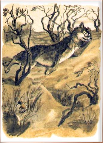 Стрелы-колючки не могли повредить волку, но одна стрела угодила ему прямо в нос, и волк проснулся. Ярты вскочил на ноги, замахнулся на волка своим острым копьём-шилом и закричал: — Пришёл твой последний час! Я — могучий пехлеван и владыка пустынь — приказываю тебе сдаться! Но волк и не подумал сдаваться. Он даже не заметил в траве могучего пехлевана. Ему показалось, что это просто пищит москит-комар. Но запах сдобной лепёшки, которую Ярты привязал к своему поясу, заставил волка насторожиться. Зверь поднялся на ноги, ощетинил шерсть, разинул пасть, облизнулся и одним духом проглотил сдобную лепёшку, а вместе с ней и могучего пехлевана. Ой, плохо пришлось Ярты в волчьем брюхе! Чуть не заплакал малыш от испуга, но во-время спохватился. — Плакать молодцу не к лицу! — решил мальчишка. — Настоящий пехлеван не то что из брюха, из-под земли выйдет на свободу! Он собрал все свои силы и стал пробираться поближе к волчьей пасти, чтобы видеть, что будет дальше. А волк выспался, зевнул, отряхнулся и знакомой тропой побежал к стаду. Скоро он увидел овец. Он притаился в кустах полыни и стал выжидать, чтобы добыча сама подошла поближе. Потом он наметил себе самую жирную овечку и пополз к ней, хоронясь в высокой траве. Он полз так тихо, что даже песок не шуршал у него под брюхом. Он был уверен в своей победе, он знал, что пастухи не увидят его, потому что у волка шерсть такая же серая, как сухая трава пустыни. Но Ярты-гулок всё видел. Когда волк хотел уже прыгнуть и схватить добычу, из волчьей пасти раздался громкий крик: — Эй, чабаны, берегите баранов! Гоните волка! Пастухи вскочили и тоже закричали: — Гоните волка! Они спустили собак и с палками бросились за зверем. Волк побежал. Собаки за ним. За собаками пастухи. И Ярты-гулок всё кричал и кричал: — Сюда! За мной! Этот волк живёт в зарослях саксаула! Убейте его! Насилу волк унёс ноги. Он не так испугался собак и палок, как того, что кто-то в нём сидит и кричит. Такого с ним еще никогда не бывало! Волк долго отлёживался в своём логовище. Но голод не давал ему покоя. Он не мог заснуть всю ночь, а под утро, пока еще не взошло солнце и пастухи еще крепко спали, серый снова пошёл на охоту. На этот раз волку тоже не повезло. Когда он подошёл к стаду, кто-то опять закричал у него из пасти: — Эй, чабаны! Волк здесь! Берегите стадо! И пастухи опять прогнали зверя. Для волка настали чёрные дни. Ни днём, ни ночью он не мог подойти к стаду. Попробуй-ка подойди, если зоркий сторож сидит не в степи у стада, а в твоём собственном брюхе! Что только ни делал волк, чтобы избавиться от Ярты-гулока: он прыгал и катался по земле, он рвал в бешенстве шерсть на своём брюхе, но дерзкий сторож не уходил и смеялся над ним: — О, премудрейший из волков! Разорви скорей своё ненасытное брюхо, вот тогда я тебя оставлю в покое! И волк целыми днями выл от злости и голода. А теперь послушай, что было дальше. Пастухи-чабаны узнали, где хоронится степной волк, и повели народ в облаву на зверя. А если народ скажет, — гром загремит! Пришёл волку последний час! Как могучий горный поток, помчались охотники по пескам пустыни. Волк услышал погоню и побежал. Он бежал изо всех сил, он прятался в руслах сухих арыков, но его поднимали собаки. Он хоронился за барханами, зарывался в песок, но везде его настигала погоня. Волк обессилел, но он был хитёр: он прыгнул в заброшенный колодец и притаи