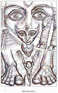 "Антропологический детектив. Боги, люди, обезьяны..." - читать интересную книгу автора (Белов Александр Иванович)Часть I АМЕРИКАНСКИЕ КОРНИ ЧЕЛОВЕЧЕСТВАМИЛЛИОНЫ ТЕЛ ОДНОГО ЧЕЛОВЕКАВ древнеиндийских Пуранах и Упанишадах фигурирует первочеловек Пуруша, его огромное тело являет собой всю нашу Вселенную. Его руки, ноги, плечи, голова, бедра, грудь, живот и поясница — все это состоит из скопления галактик и звездных систем. У китайцев первочеловеком, из тела которого сделана Вселенная, является Пань-Гу. У древних египтян ту же функцию выполнял бог Птах. Отдельные божества представляли части его тела. Можно сказать, что галактики, являясь, по существу, органами «Большого Человека», представляют из себя уменьшенную копию того же человека. Также планеты и звездные системы, например наша Солнечная система, по древним источникам представляют из себя части тела космического гиганта. У индусов творцом всех земных живых существ является Брахма. Он рождается в золотом яйце, затем силой мысли разделяет яйцо на две половины: землю и небо, а себя на две части — мужскую и женскую. Затем он порождает растения, животных, людей. Один день Брахмы равен 4 320 тыс. «человеческих» лет. Днем Брахма создает землю, а ночью, когда он отдыхает, со дна океана поднимается огонь и уничтожает ее, но Брахма вновь создаёт её в следущий свой день. В иранской традиции земля и небо представляют из себя части тела космического великана Имира (Йимы-Гайомарты). После того как Один убивает Имира, его череп становится небом, кровь — морем, плоть — землёю, кости — горами, волосы — лесом. Адепты розенкрейцеров (древнего мистического ордена Розы и Креста) на своих собраниях чертили схему развития человечества. Она выглядела так. Первая раса людей на Земле — потомки лунных предков Питри. Первоначальный человек был существом эфирной формы, лишенной плоти. Первые жители Земли выделили свои тонкие тела из себя самих и стали творцами последующих тонких, невидимых глазом тел человека. Они были не только бесплотные, но и бессмертные. Вторая раса возникла из первой. Тогда у людей появился первичный процесс размножения. Их тонкие тела (ауры) набухали и затем выделяли из себя почку — ауру нового человека. Постепенно новое тело отпочковывалось и отделялось от родительской сущности. Светящиеся сущности, по форме напоминающие человека, быстро заселили Землю. Третья раса человеческих существ возникла от своих предшественников — второй расы. Были они «потом рожденные». Тонкое тело человека выделяло само из себя «каплю пота», которая, материализуясь, образовывала первичное оплодотворенное яйцо — половую клетку человека, из которого развивался плод. Причем «пот» выделялся не из половых органов, а откуда угодно, даже из области головы. Плоды вынашивались не в теле людей, а в водах океана. (Который, вероятно, был гораздо чище, чем теперь.) Морская вода, содержит состав солей, близкий к плазме крови. Все необходимые элементы для питания зародыша, а также воздух поступали через пористую оболочку плода, а отходы жизнедеятельности беспрепятственно выходили наружу. Надо думать, что в то время человеческие зародыши росли на океанических отмелях, как капуста, прикрепившись бесполезной пуповиной к каменистому или песчаному дну. Из морской воды выходил «готовый» ребенок. (В этом смысле теперь у нас де