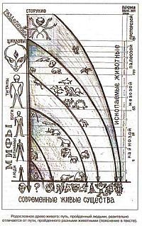 Родословное древо живого: путь, пройденный людьми, разительно отличается от пути, пройденного разными животными (пояснение в тексте). Боковыми ветвями, отпочковавшимися в разное время от ствола человечества, явились животные сообщества. Разные классы вымерших и современных животных ведут родословную от своих предков, давно или сравнительно недавно покинувших сообщество людей; по отношению к людям животные сильно отклонились от первоначального образца. В современной фауне членистоногие представляют выродившихся потомков сторуких. Рептилии, амфибии и птицы являются далекими отпрысками циклопов. Родословную титанов представляют гигантские звери. Современные млекопитающие — потомки богоподобных существ (богов). Великаны представлены вымершими гигантскими и современными человекообразными обезьянами. И только от людей зависит, кто именно из животного царства будет представлять их родословную… Хорошо бы, чтоб свою родословную современный человек представлял сам. Однако из сказанного вовсе не следует, что все почтенные предки наши выродились в зверей или превратились в современных людей. Большая и лучшая их часть переселилась в иные светлые миры, откуда земная жизнь кажется им тяжким бременем или неприятным воспоминанием. Перерождаются друг в друга только те, кто ищет счастья в этом изначально несчастном мире, и эта непрямая дорога заводит их в животные и растительные тела, если они не могут отличить истинное от иллюзорного… |