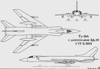 Вопрос по модернизации самолета Ту-28 и комплекса Ту-28-80 ставился в ОКБ еще на этапе разработки и постройки первого опытного экземпляра. 18 июля 1959 года вышло Постановление Совета Министров СССР № 735-338, в котором перед разработчиками комплекса Ту-28-80 ставились задачи по дальнейшему его развитию, с доведением высоты перехватываемых целей до 20000-25000 м при скоростях 1800-2000 км, увеличение дальности ракет до 60-70 км и дальности обнаружения РЛС до 120-160 км. Учитывая эти дополнительные требования по комплексу, ОКБ в том же 1959 году приступило к работам по модернизированному варианту комплекса с РЛС типа "Смерч-А", ракетами К-80М и самолету с двигателями ВД-19. Помимо новых требований заказчика, перед ОКБ настоятельно стояла задача по снижению массы пустого самолета, с тем чтобы обеспечить заявленные данные по самолету. Модернизированный самолет получает обозначение Ту-28А, а комплекс - Ту-28А-80. В июне 1960 года С.М.Егер в своей докладной записке А.Н.Туполеву по поводу перетя-желения конструкции опытного самолета "128" в частности отмечал: "При проектировании опытного самолета "128" конструкторскими бригадами допущено значительное перетяжеление проектируемых ими агрегатов, в результате чего: вес пустого самолета - 23800 кг, т.е. на 2400 кг больше весового лимита и на 3500 кг больше веса, принятого при эскизном проектировании. Максимальный взлетный вес самолета - 37000 кг, в том числе 11000 кг топлива. …В результате утяжеления летные характеристики самолета "128" изменяются следующим образом: …Таким образом, дальность полета и время барражирования стали меньше заданных величин, а по взлетно-посадочным характеристикам самолет вышел за допустимые нормы аэродрома 2-го класса. Представляется совершенно возможным провести облегчение самолета. В качестве исходных мероприятий для этого могут быть: - уменьшение расчетной перегрузки с п=3,5 до п=3,1; - изменение порядка расхода топлива с тем, чтобы топливо в первую очередь вырабатывалось из фюзеляжа, а расход топлива из крыла шел в конце полета; - увеличение хода амортизаторов шасси для уменьшения расчетных нагрузок во всех посадочных случаях. Возможно облегчить машину минимум на 2 тонны, приняв окончательно взлетный вес 35,0 тонн. …Кажется целесообразно, чтобы к моменту окончания испытаний, т.е. к концу 1961 года, мы имели бы облегченный экземпляр самолета. Для этого необходимо: - сразу по окончанию работ по первому опытному экземпляру и экземпляру для статических испытаний начать постройку на нашем заводе облегченного самолета Ту-28А, хотя бы под флагом постройки для модификации под двигатели ВД-19, срок выпуска модифицированного самолета установить - третий квартал 1961 года; - как указано в проекте Постановления по развитию комплекса Ту-28-80, завод № 64 в третьем квартале должен выпустить три модифицированных самолета Ту-28 для установки на них двигателей ВД-19. Совершенно необходимо, чтобы эти модифицированные самолеты строились по облегченным чертежам… Работы по двигателю ВД-19 в ОКБ-36 начались еще осенью 1958 года, в конце 1960 года начались его стендовые испытания. Его взлетная форсажная тяга равнялась 13000 кгс, максимальная форсажная тяга на высоте 14000 м при скорости 2230 км/ч равнялась 8400 кг и на высоте 20000 м при скорости 1600 км/ч - 2350 кгс, на дозвуке на крейсерском бесфорсажном режиме удельный расход топлива соответствовал 0,97 кг/кгс-ч. Эт
