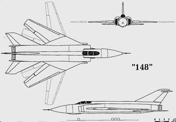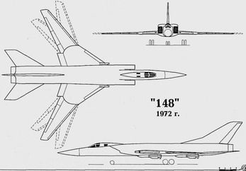 Работы по глубокой модернизации авиационно-ракетного комплекса дальнего перехвата на базе самолета Ту-128 и тупиковое положение с проектированием самолета-носителя для нового комплекса Ту-138 потребовали от ОКБ настойчиво искать новые неординарные пути в развитии линии дальних тяжелых истребителей-перехватчиков. В частности, практически одновременно с началом проектирования дальнего ракетоносца с крылом изменяемой стреловидности самолета "145", в ОКБ началось проектирование авиационного комплекса дальнего перехвата, в основе которого должен был лежать тяжелый истребитель-перехватчик с крылом изменяемой стреловидности. Проектирование нового комплекса, получившего по ОКБ обозначение самолет "148" (Ту-148), началось в 1965 году. Осенью 1965 года в ОКБ определились с основными характеристиками комплекса, его назначением и мо-дификационными возможностями с учетом новой конфигурации самолета-носителя. Применение крыла изменяемой стреловидности в полете в сочетании с двумя ТРД ВД-19Р2 (дальнейшее развитие ВД-19 с взлетной тягой 14200 кгс) позволяли разрешить многие противоречия предыдущих одноре-жимных проектов и значительно расширить возможности тактического применения самолета. Ожидалось получить в конфигурациях максимальной и большой стреловидности скорости при полетах на высотах 50-100 м - 1400 км/ч и на высотах 16000-18000 м - 2500 км/ч и практическую дальность на этой скорости - 2500 км и при полетах на высотах 50-500 м на скоростях 1400 км/ ч - 570 км, на скорости 1000 км/ч -1850 км. При стреловидности крыла, соответствующей крейсерскому полету на дозвуке, обеспечивалась дальность 4800 км. В случае применения дозаправки топливом в полете показатели по дальности, в зависимости от режима полета, увеличивались на 30-40%. Взлетно-посадочные характеристики, даже с увеличением взлетной массы Ту-148 до 55-60 тонн (для Ту128 - 43 тонны), получались значительно лучше, чем у Ту-128: длина разбега 800 м плюс возможность использования с аэродромов третьего класса и с грунтовых ВПП (для Ту-128 - 1350 м и второй класс соответственно).