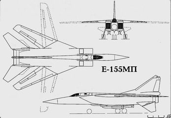 До 1969 года все работы базировались на основе проекта "518-21" с крылом изменяемой стреловидности. Однако более детальные исследования предложенной схемы показали, что при принятой компоновке достичь требуемых военными скороподъемности и практического потолка невозможно. Конструкция самолета оказалась перетяжелена за счет установки крыла изменяемой стреловидности. От подобного крыла отказываются и практически постепенно возвращаются к проверенной и неплохо зарекомендовавшей себя схеме МиГ-25. В 1969 году в ОКБ начинаются работы над проектом Е-155МП (изд. 518-22) с фиксированным трапецивидным крылом. Работы над остальными вариантами постепенно были свернуты (предпочтение ВВС было отдано развитию проекта Т-6 с изменяемой стреловидностью крыла -фронтовому бомбардировщику Су-24). В ходе оптимизации предложенной схемы прорабатывалось несколько различных вариантов возможных компоновок. В частности, рассматривался вариант "518-55", представлявший увеличенный вариант будущего МиГ-29. В 1971 для будущего Е-155МП была окончательно утверждена схема с фиксированным трапециевидным крылом по типу МиГ-25, но с развитыми наплывами и механизированной передней кромкой, двухкилевым оперением, конформной подвеской ракет под фюзеляжем и двухместной кабиной экипажа по схеме "тандем" (некоторые промежуточные варианты проекта "518" имели размещение экипажа по схеме Су-24 - "рядом" в общей кабине). Одновременно был осуществлен переход на более экономичные на дозвуковом крейсерском режиме двигатели Д-30Ф-6, что в значительной степени компенсировало снижение аэродинамического качества на дозвуке за счет отказа от крыла изменяемой стреловидности. Все эти новации нашли в 1972 году отражение в эскизном проекте истребителя-перехватчика Е-155МП (изд.83), который был построен, испытан и внедрен в серийное производство и на вооружение под обозначением МиГ-31. |