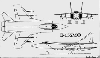 Как отмечалось выше, к работам над перспективным новым дальним сверхзвуковым истребителем-перехватчиком для авиации ПВО помимо ОКБ А.Н. Туполева было привлечено ОКБ А.И.Микояна. Практически сразу после начала летных испытаний опытного истребителя-перехватчика Е-155П (МиГ-25П) и разведчика-бомбардировщика Е-155Р (МиГ-25РБ) в ОКБ на их базе началось проектирование семейства дальних сверхзвуковых самолетов, которые должны были в будущем заменить или дополнить в строю машины семейства МиГ-25. Развитие средств воздушного нападения ставило перед ПВО страны необходимость принятия на вооружение в обозримом будущем истребителя-перехватчика, имеющего уникальные высотно-скоро-стные характеристики МиГ-25П, но обладающего значительно большей дальностью полета и оснащенного бортовой РЛС с большей дальностью обнаружения воздушных целей, возможностью одновременного обстрела нескольких целей ракетами с большей дальностью пуска, способностью ведения групповых действий по контролю воздушного пространства и перехвату, а также эффективного поражения маловысотных крылатых ракет нового поколения наземного и воздушного базирования и низко летящих ударных самолетов. В ОКБ А.И.Микояна подобный комплекс дальнего перехвата рассматривался как дальнейшее развитие комплекса С-155 на базе МиГ-25П. Как и в случае с туполевскими проектами по теме "148", ключевым моментом в создании нового комплекса должно было стать оснащение будущего самолета-перехватчика новой более мощной, по сравнению с РЛС типа и "Смерч-А" самолета МиГ-25П, радиолокационной станцией с фазированной антенной решеткой типа "Заслон", управление работой которой осуществлялось с помощью быстродействующей БЦВМ "Аргон". По сравнению с РЛС "Смерч-А", "Заслон" могла обеспечить вдвое большую дальность обнаружения целей, возможность одновременного обзора воздушного пространства в значительно большем диапазоне по азимуту и углу места, сопровождение и отображение на бортовом экране тактической обстановки до 10 целей с возможностью перехвата четырех из них ракетами типа К-33. Выбор цели для поражения должен был выполняться автоматически по критериям, заложенным в БЦВМ, или по решению экипажа. Значительно возросшие тактические возможности, по сравнению с МиГ-25, необходимость передачи и приема прицельной информации, а также требование увеличения продолжительности полета потребовали, как и в случае с проектами Ту-128, Ту-138 и Ту-148, увеличить экипаж перехватчика до двух человек, ввода второго члена экипажа - летчика-оператора. Работы в ОКБ А.И.Микояна над дальнейшим развитием элементов комплекса С-155 в сторону создания дальнего комплекса перехвата С-155М начались одновременно с работами туполевцев по Ту-148. Первым в этом ряду стал проект экспериментального самолета Е-158 (изд. 158), представлявший собой глубокую модернизацию Е-155 под крыло с изменяемой стреловидности и более экономичные двигатели РД-19М (на начальном этапе предполагалось использовать штатные Р15Б-300 проекта Е-155) и РЛС "Смерч-100". Проект в варианте перехватчика получил поддержку в МАП и в правительстве (Приказ МАП № 95 от 27.05.65 г. и протокол ВПК № 38 от 17.11.65 г). В течение полугода в ОКБ был подготовлен эскизный проект по теме, изготовлены модели (на первое января 1966 года готовность проекта составляла 11%). 30 декабря 1965 года согласно Приказа МАП № 422 