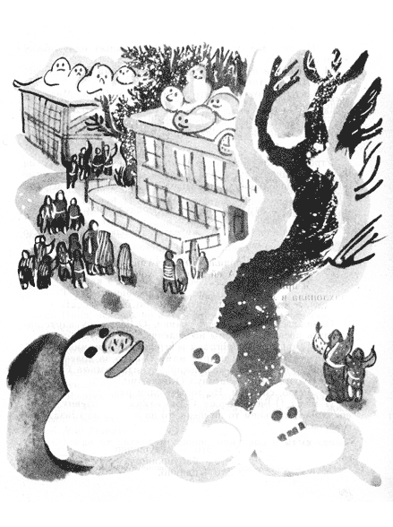 «Какая мама красивая!» — подумал О-Бакэ-тян. — Ну вот, всё готово. Пусть Чичи выпьет одну ложку этого лекарства. И, зачерпнув из котла ложку варева, мама О-Бакэ передала её О-Бакэ-тяну. О-Бакэ-тян помчался что было духу к Чичи. Меж тем пошёл снег. — Вот хорошо! Мы будем лепить снежных о-бакэ! — воскликнул О-Бакэ-тян, летя по небу. Утром жители городка сильно удивились: на улицах, на почтовых ящиках, тут и там торчали удивительные снежные о-бакэ. На школьной крыше сидел рядышком целый десяток о-бакэ. — Кто же это слепил таких причудливых о-бакэ? — удивлялись люди. Вы-то знаете, кто. А жителям городка совсем было невдомёк. |