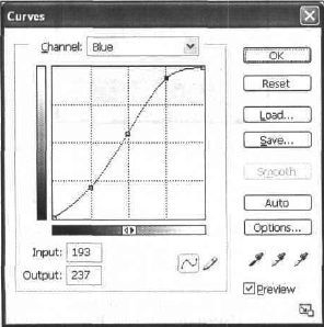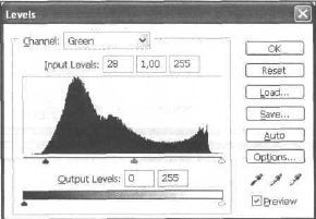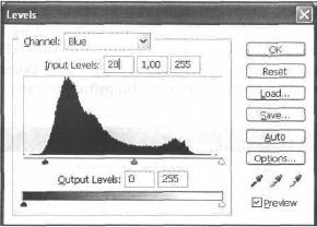 Рис. 33.6. Корректируйте по очереди каналы для создания реалистичного эффекта. Для начала сделайте затемнение синего канала, передвинув левый ползунок вправо (рис. 33.7). Затем проделайте похожую операцию с красным каналом (рис. ЗЗ.8). И, наконец, с зеленым (рис. 33.9). В таком виде оно больше годится для печати (рис. CD-33.I0). В результате предыдущих корректировок теряются некоторые оттенки. Восстановите это следующим способом: создайте новый настраиваемый слой командой Layer | New Adjustments layer | Hue/Saturation (Слой | Новый настраиваемый слой | Оттенок/Насыщенность). Настраиваемые слои служат для экранирования, дополнительной настройки оттенков изображения.