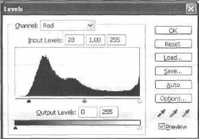 Рис. 33.2. Можно перемешать ползунки в любом из трех каналов. Так, добавление красного усиливает красный цвет, уменьшение зеленого также усиливает красный, уменьшение синего усиливает желтый. Если вы перемещаете левый ползунок Output Levels (Выходные уровни) вправо, то изображение осветляется, а если потянуть правый ползунок влево, то затемняется (рис. 33.3). И наоборот: если двигать вправо левый ползунок в группе Input Levels (Входные уровни), то изображение будет приобретать темные тона, если вы будет двигать правый влево, то изображение будет осветляться.