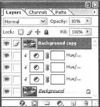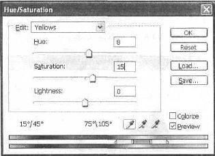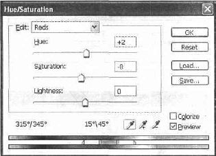 Рис. 33.9. Вам нужно настроить оттенки красного и желтого, а затем произвести общую корректировку. Корректировка довольно проста и не требует дополнительных пояснений. В самом деле, меняются только Hue (Оттенок) и Saturation (Насыщенность) (рис. 33.11–33.13). Для каждой манипуляции создавайте новый слой (рис. 33.14). Сгруппируйте эти слои.