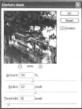 Рис. 33.18. Сделайте копию слоя, который вы корректировали, и переместите его выше предыдущих. Подчеркните границы фильтром Unsharp Mask (Неострая маска) (рис. 33.18). Измените Opacity (Непрозрачность) слоя, установив 83 %. Изменяя непрозрачность, вы корректируете нужную цветопередачу и (в данном случае) четкость границ (рис. 33.19). На этом все (рис. ЦВ—33.20).