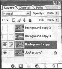 Рис. 35.3. Четыре слоя нужны, чтобы последовательно применить несколько фильтров и созданные эффекты соединить потом в один. Сейчас на первом этапе нужно применить фильтр Palette Knife (Палитра ножа). Данный фильтр уменьшает деталь в изображении, чтобы дать эффект тонко окрашенного холста. Итак, воспользуйтесь им, выполнив команду Filter | Artistic | Palette Knife (Фильтр I Артистичность I Палитра ножа) (рис. 35.4, 35.5).