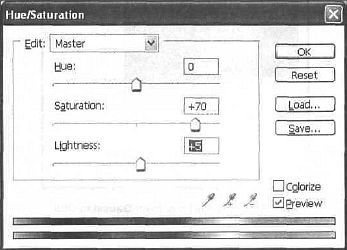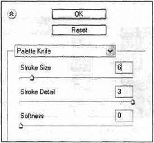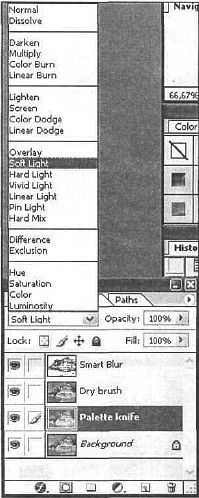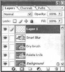 Рис. 35.5. Когда пы работаете с несколькими слоями, применяя различные фильтры, то лучше переименовать слои в соответствии с названием фильтров. Для переименования слоя нужно дважды щелкнуть на его названии. Выберите тот слой, к которому вы применили фильтр, и переименуйте его в "Palette_Knife". Теперь выполните команду Image | Adjustments | Hue/Saturaiion (Изображение | Настройка | Оттенок/Насыщенность) и задайте значения, как на рис. 35.6. Тем самым вы добавите ярких цветов в изображение. Этот шаг очень важен, так как от него зависит натуральность эффекта (рис. CD—35.7).