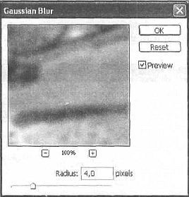 Рис. 35.6. Для небольшого размытия цветов используйте фильтр Gaussian Blur (Размытие по Гауссу), для этого выполните команду Filter | Blur | Gaussian Blur (Фильтр | Размытие | Размытие по Гауссу) и задайте радиус 4 (рис. 35.8). Сделайте активным второй слой, который вы дублировали, и переименуйте его в «Dry_Brush». Выполните команду Filter | Artistic | Dry Brush (Фильтр | Артистичность I Сухая кисть) (рис. 35.9, 35.10). Для чего вы будете применять этот фильтр, станет понятным из его определения. Этот фильтр красит грани изображения, используя технику сухой щетки (что-то среднее между маслом и акварельными красками). Фильтр упрощает изображение, уменьшая диапазон цветов в областях общего цвета.