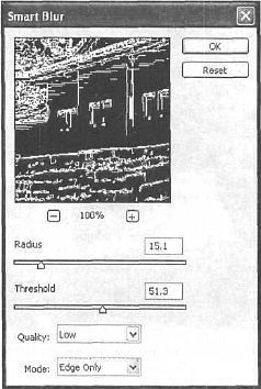 Рис. 35.12. После применения фильтра Smart Blur (Сильное пятно) изображение должно выглядеть так: белые линии по черному фону. Теперь необходимо сделать инверсию (выполнив комбинацию клавиш lt;Ctrlgt;+lt;Alt+lt;Igt;). Честно говоря, пока похоже на дом после пожара, но это явление временное (рис. 35.13).