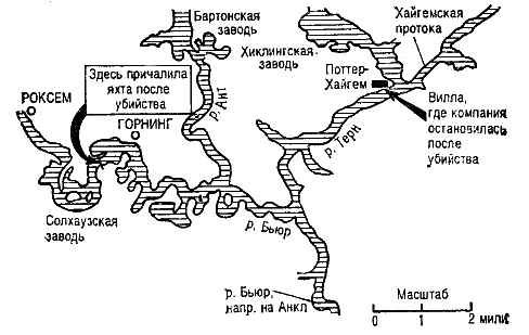 — Вы пришвартовались где-то здесь. — Финбоу сделал карандашом пометку на карте и затем произнёс, а вернее сказать, пропел, своё «та-а-ак». От места нашей стоянки в направлении Солхауза на целых три четверти мили тянулась прямая лента реки! — Какую скорость могла развить яхта при ветре, который дул сегодня утром? — спросил он живо. — Ветер был основательный, — ответил я, — но в мореходных качествах парусников я не очень-то разбираюсь. — Я тоже, — сказал Финбоу. — Но надо помнить, что успех в жизни зависит от двух ценных качеств, и только от них. Первое — нужно знать, куда обратиться за тем, что тебе необходимо, и второе — уметь добиться, чтобы это необходимое было сделано. — Он улыбнулся. — Я знаю, кто может дать нам исчерпывающие сведения о парусниках. Бенсон. Знаешь, тот, что живёт в Норидже. Он как свои пять пальцев знает всю Броудскую систему, все типы парусников и их мореходные качества. Я позвоню ему. Через несколько минут Финбоу вернулся. — Бенсон говорит, что скорость достигала от двух с половиной до трех миль в час. Он абсолютно в этом уверен. Такие яхты, оказывается, имеют весьма ровный ход и не очень подвержены капризам погоды. Кроме того, он говорит, что ветер сегодня устойчивый. Прикинув в уме, я сказал: — Из этого следует, что убийство совершено в 9.07-9.10, никак не раньше. — Но ты же сам говорил, что Уильям почему-то считает, что преступление совершено не раньше 9.15, — напомнил мне Финбоу. — Так ведь он не знал, что на этой реке есть такой длинный, ровный отрезок, — ответил я и… вдруг почувствовал, как в мою душу закрадывается сомнение. — Ты становишься недоверчивым, — заметил Финбоу. — Во всяком случае, такое определение времени снимает подозрение с тебя самого, потому что все как один заявили Берреллу, что ты все время находился в каюте — как до 9.00, так и позже, вплоть до того момента, когда вышел с Эвис на палубу. — Я уже не раз говорил тебе, что я его не убивал! — возмутился я, но Финбоу уже снова записывал: 8.50.Иен окликает Роджера и слышит ответ. 8.55-9.00.Иен и Тони входят в каюту. 9.05-9.10.Филипп и Уильям входят в каюту. Уильям утверждает, что между 9.00 и 9.05 пытался пройти в ванную за койкой Филиппа: Все это время он слышал голос Филиппа из ванной. Спустя две или три минуты он вошёл в каюту Филиппа. Филипп больше в свою каюту не возвращался. 9.07. самое раннее время, когда убийца мог бросить штурвал (допустим, 9.05 крайний — срок). 9.12. Кристофер выходит из каюты. 9.15.Кристофер возвращается в каюту. 9.16.Эвис входит в каюту. 9.18.Тони выходит из каюты. 9.22.Филипп выходит из каюты. 9.24.Эвис и Иен выходят из каюты. 9.25.Роджера находят мёртвым. — Вот примерно в такой последовательности все происходило, верно? — спросил Финбоу. — Мой график основан на сведениях, полученных Берреллом, и на твоём рассказе. Ручаться, что он составлен с точностью до одной минуты, нельзя, но тем не менее общее представление он даёт. — Уильям определил самый ранний срок совершения убийства — 9.15, — размышляя вслух, произнёс я. — Если бы это соответствовало действительности, он имел бы стопроцентное алиби. В противном же случае… — Я почувствовал нервную дрожь. — В противном случае, — рассудительно закончил Финбоу, — пока что все, кроме тебя, подпадают под подозрение. — Все? — удивился я. — Все до единого, — подтвердил Финбоу. — Факты, только что изложенные мной, почти не вызывают сомнений… во 