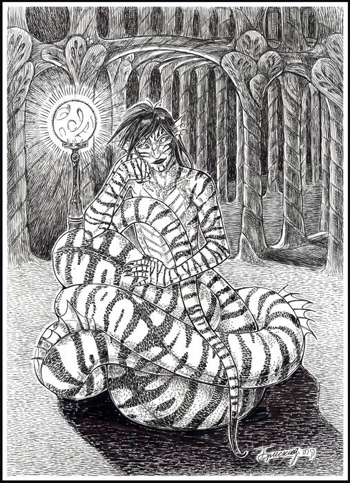 Виктория Иванова Ступень третья. ХэссарС-сеш-ш эаКонечно, признаваться в подобном довольно рискованно, могут понять не так. Но, похоже, я теперь отлично понимаю людей, страдающих раздвоением личности. Почему? Ну, скорее всего потому, что сам испытал нечто похожее. Мне было уютно и спокойно, но ровно до тех пор, пока меня не… разделили. Наверное, это самое верное слово. Довольно странно ощущать себя состоящим из нескольких частей. Даже не странно, а… неудобно. Это раздражало, злило, мешало спать. Наконец, моё терпение закончилось, и я решительно «собрался» воедино. Не пытайтесь узнать, как именно всё произошло — не расскажу. Понятия не имею. Просто… представьте своё состояние, если вам, к примеру, чтобы почесать руку, надо идти на соседнюю улицу? Вот и я разозлился и… соединился. Перевернулся на другой бок, свернулся поуютней, снова погружаясь в сон… Второе побуждение было более приятным. Правда, оно сопровождалось жутким свербежом в носу, как перед чихом. Пришлось быстро зажать переносицу. Уф… вроде бы прошло… — ЧХИ! — пыль взметнулась вверх, но поток воздуха смёл её куда подальше. Зато сразу стало легче. Потянувшись всем телом, я удовлетворённо заурчал и нехотя открыл глаза. Пару раз моргнул, отгоняя сон, и рассеяно уставился на собственные пальцы. Серебристо-белые, полосатые… Полосатые?! Рука лихорадочно рванула к груди, но вместо знакомой выпуклости амулета нащупала только кожаный шнурок. Что такое «не везёт»… Осторожно приподнявшись, я принялся оценивать масштабы катастрофы. Иначе ведь и не скажешь… проснулся непонятно где, амулета личины как не бывало… Установить место собственного отдыха оказалось самым легким делом. Судя по запаху — я находился в библиотеке, на одном из шкафов где-то в глубине переходов. Ну и за каким… овощем сюда пришел? Память ехидно оскалилась беззубым провалом бездны, а потом на меня обрушился водопад воспоминаний. Создавалось впечатление, что всё это происходило не со мной. Будто я наблюдал за событиями как бы со стороны. Ох, ё… Память всё так же услужливо подкидывала новые и новые словечки, почерпнутые у завсегдатаев таверны. Нет, такое я поизносить не буду. Мало ли, услышит кто? Кстати, о «кто»… Осторожно потянув воздух носом и насторожив гребни, я принялся сканировать окружающее пространство. Кроме меня никаких живых особей в библиотеке не было, так что можно не забиваться в угол. И немедленно связаться с ректором. Трёпки мне, конечно, не миновать. Центральный зал, наверное, пришлось отстраивать едва ли не заново. При воспоминании о драке я невольно зашипел. Даже просто просматриваемые в памяти моменты вызывали приступы неконтролируемой злости. Это плохо. Это — Мастер Реклар? — мысленно позвал я, но очень осторожно. Во-первых — мало ли, вдруг он спит или ещё что? Время суток тоже не определялось. Хотя… это явно не день, иначе народу было бы — не протолкнуться. А во-вторых, мне ещё надо спешно возвести ментальные оборонительные порядки. Не думаю, что кто-то научился нормально «разговаривать» телепатически… Как оказалось, моя предусмотрительность была не лишней. Вопль, прозвучавший вслед за обращением, мог оставить меня идиотом на всю оставшуюся жизнь. Правда, содержал он больше эмоций, вся информация сводилась к моему имени. Которое я и без него помню. Когда же первоначальная волна схлынула и можно 