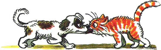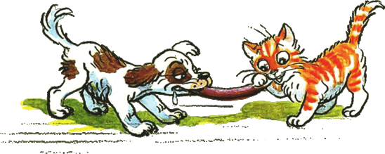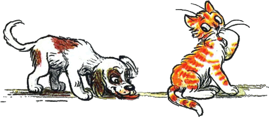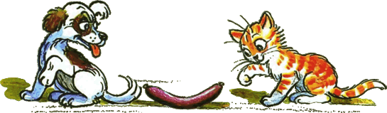 — Действительно, — согласился котёнок, — не знаем. Тогда давай так: ты начнёшь есть сосиску с одной стороны, а я — с другой. Там, где мы встретимся, и будет как раз середина. — Хорошо, — согласился щенок, и они начали есть.