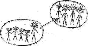 It pointed from itself to the group of new creatures, back and forth. Ani watched, confused; then Ninto touched her on the shoulder. “I think it wants to go back to its own kind,” Ninto said. “We can’t do that,” Ani replied. “We have to take it back to Ilto, and we don’t know where its people are.” “After Ilto dies we can take it back. Ask it where its people are.” Ani touched the new animal on the shoulder to get its attention. She pointed at the two drawings, and nodded to show she understood. Then she turned an interrogative shade of purple and spread her ears to show she was asking a question. She pointed at the drawing of the new creatures, and then pointed in all directions. The animal watched attentively, but didn’t seem to understand what she was trying to ask it. Ani picked up the stick, and drew ovals full of new creatures all around the group of Tendu. Then she stood the new creature on the drawing of the Tendu and pointed at each drawing of new creatures, flushing questioningly at each one. The animal bobbed its head again. It smoothed the dirt with its hands, looked carefully up at the canopy, and began to draw.