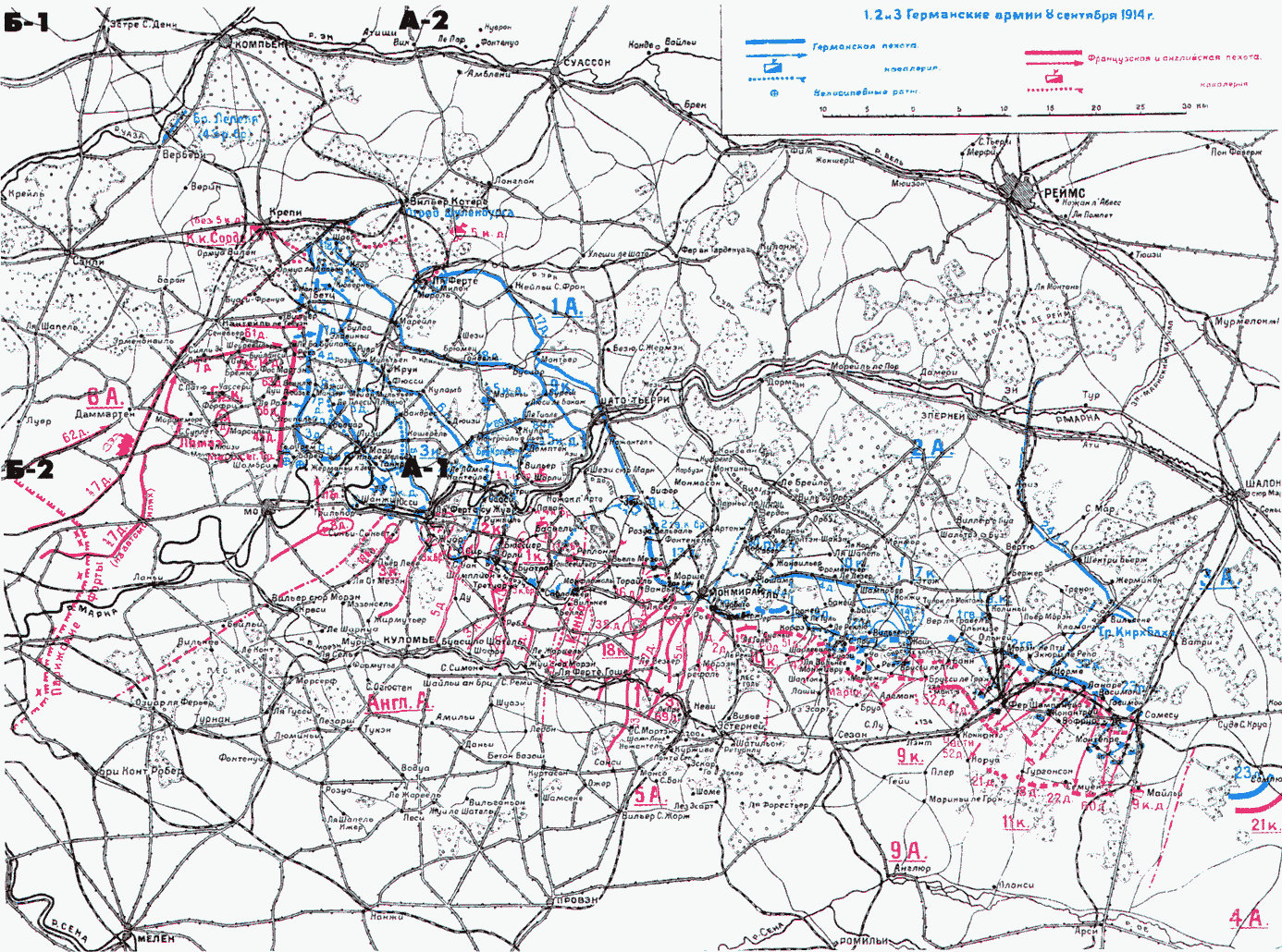 Центральной символической картиной Марнской битвы следует считать не грандиозные батальные сцены, а форсированный марш двух германских корпусов из района Эстерне к полю боя, разгоревшегося севернее Марны. От Эстерне (Estemay) до Ла-Ферте — Милон (La Ferte — Milon) по прямой расстояние около 60 км; фактический маршрут пехоты между этими двумя пунктами был почти вдвое длиннее — около 120 км. Этой цифрой определялось то усилие, которое нужно было сделать для осуществления контрманевра 8 сентября в 9 ч. 15 м. 9–й арм. корпус во время своего движения получил следующее указание от