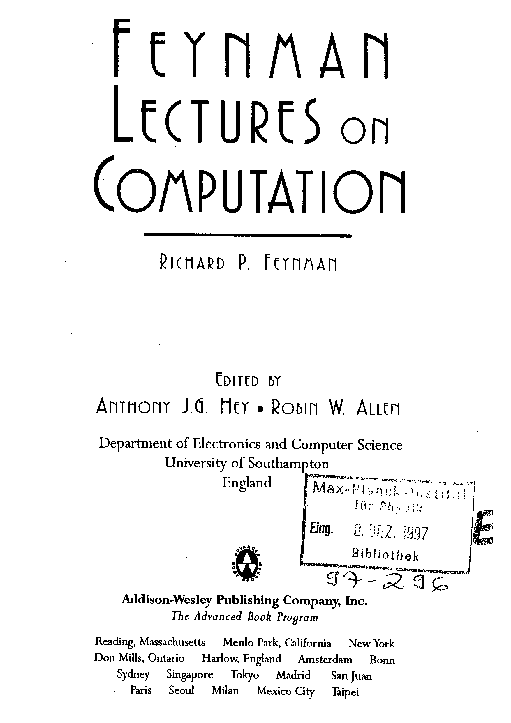 "Lectures on computation" - читать интересную книгу автора (Richard P. Feynman)