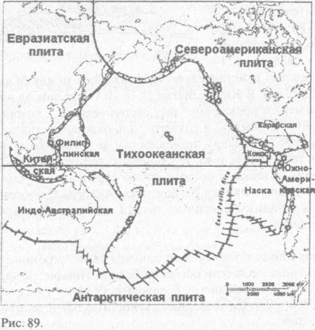 Гесиод пишет о Гее: с одной стороны были "огромные холмы и величественные местности обитания Богини-Нимфы"; с другой стороны — "пустынный Понтус, бесплодная бездна с ужасной язвой". Довольно схожее описание расколотой планеты приводит и Книга Бытия: (Быт. 1:9-10) Выходит, спустя тысячелетия после шумеров и современных им культур наши предки (включая авторов и составителей Книги Бытия), а затем и ученые XX века приняли шумерскую космогонию. Причем фактически ничего о ней не зная! Какие еще подтверждения "раскола" Тиамат можно привести? Масса коры Луны и Марса составляет около 10% их масс. У Земли эта цифра не превышает 0,4—0,5% [193, с. 9]. В 1988 году руководимая Доном Андерсоном группа геофизиков из Калтека доложила Американскому Геологическому обществу о том, что обнаружила часть "недостающей коры". Проанализировав распространение сейсмических волн, порождаемых землетрясениями, специалисты установили, что земная кора погрузилась в мантию на глубину около 400 км. Но и с учетом этого масса коры составляет не более 4% общей массы. Ученые полагают, что земная кора состоит из "огромных плит", некоторые из которых в прошлом погрузились, ушли внутрь Земли . Одной из крупнейших плит является Тихоокеанская (рис. 89). Но эта гипотеза не отвечает на вопрос: