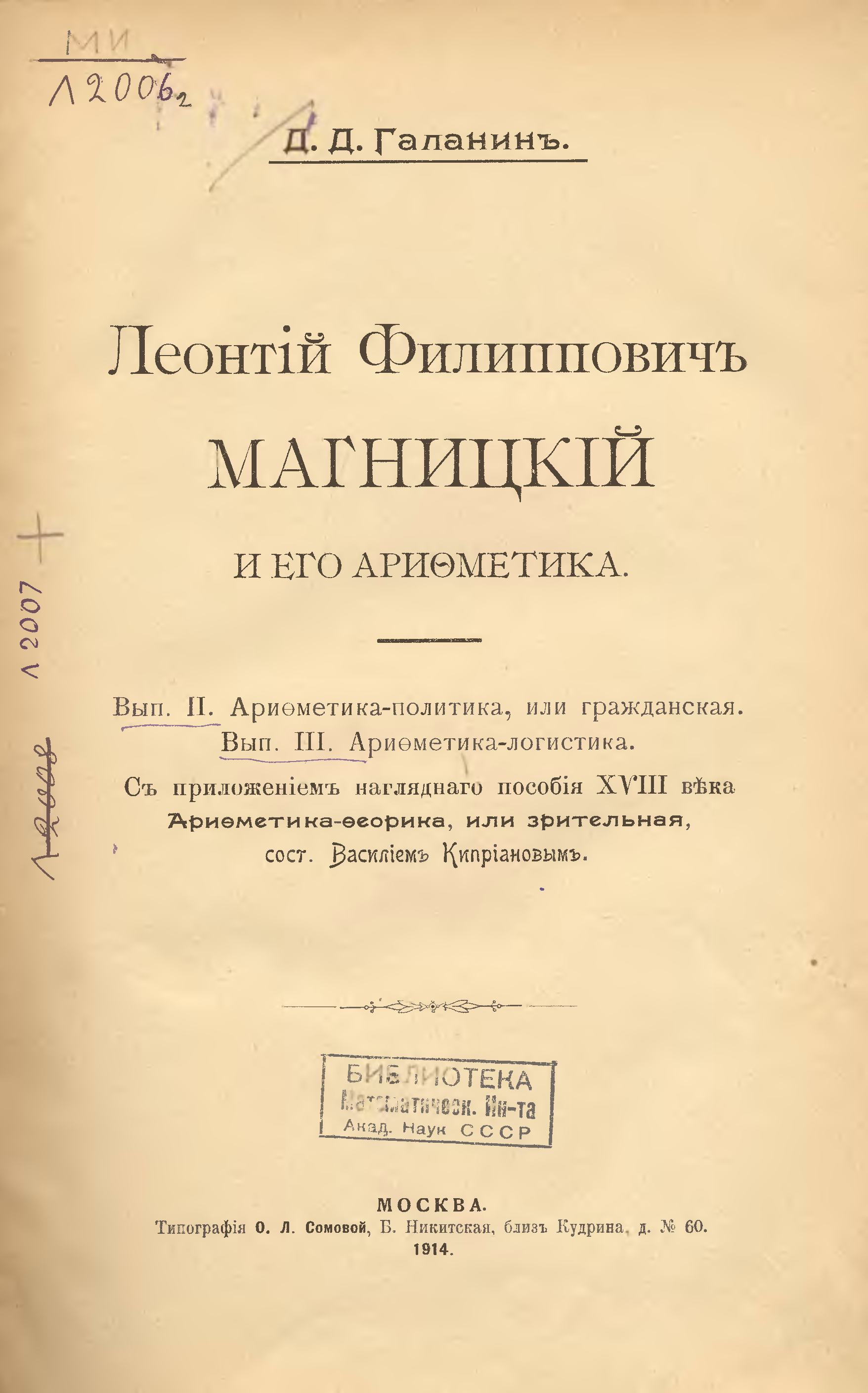 "Леонтий Филиппович Магницкий и его Арифметика. Вып. 2 - Арифметика-политика, или гражданская. Вып. 3 - Арифметика-логистика" - читать интересную книгу автора
