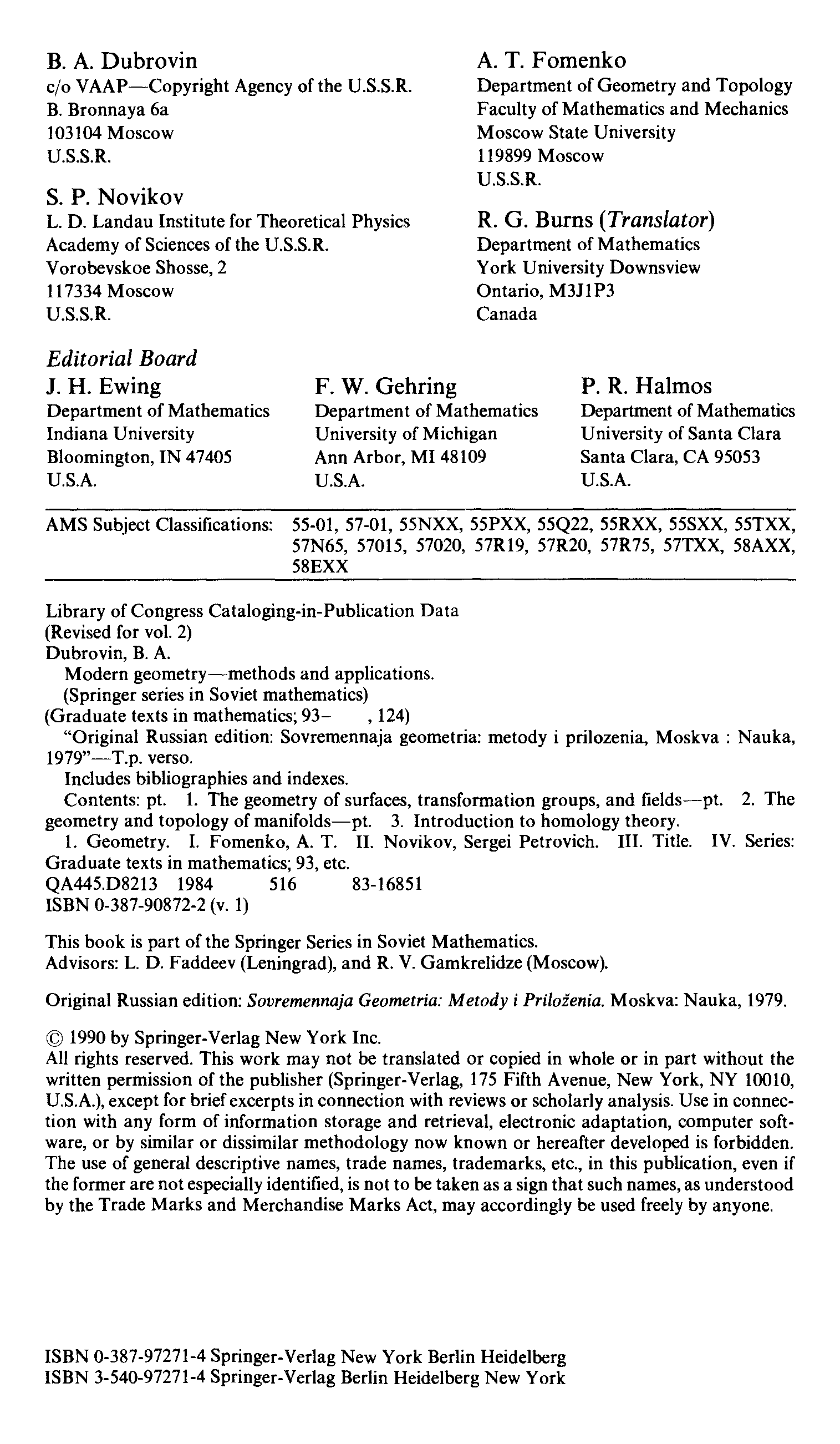 (B.A. Dubrovin, A.T. Fomenko, S.P. Novikov, Robert G. Burns)