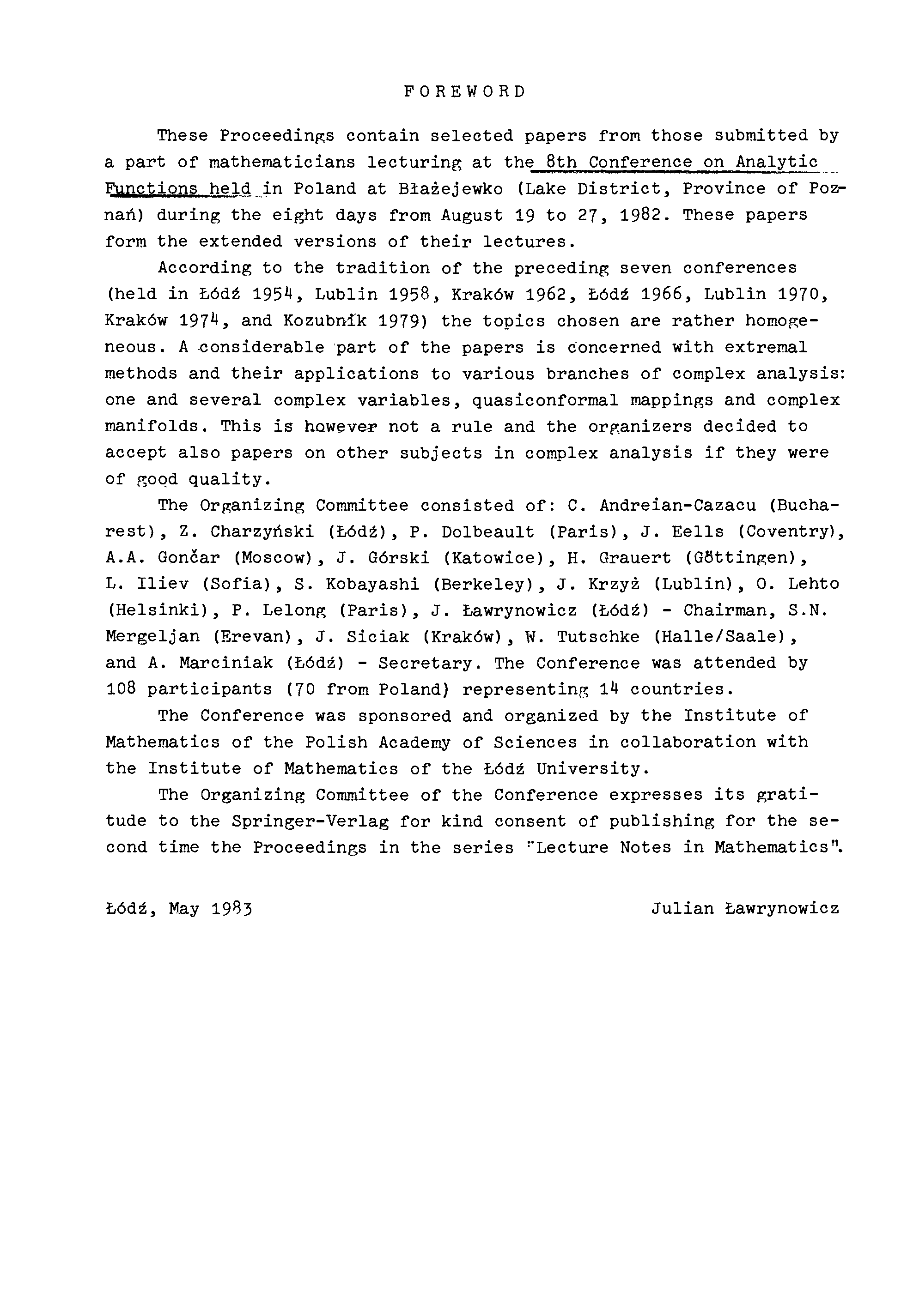 "Analytic Functions, Blazejewko 1982" - читать интересную книгу автора (J. Lawrynowicz, J. Lodz)