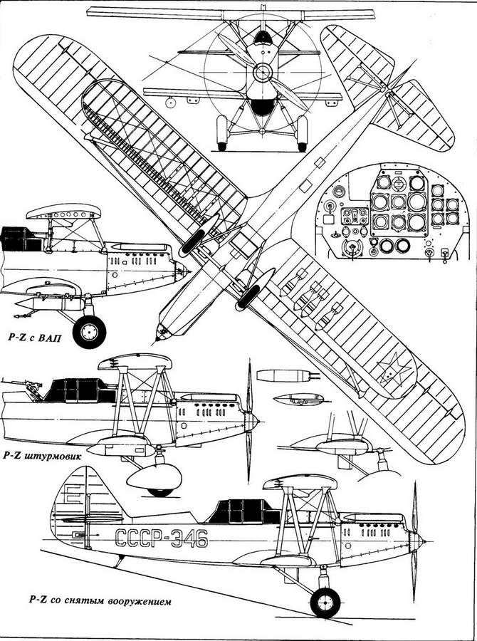 P-Z - заправка топливом. Фонарь стрелка полиостью сдвинут вперед Появление этого разведчика и одновременно легкого бомбардировщика было предрешено с первого момента появления Р-5. Понятно было, что со временем базовый самолет будет совершенствоваться в сторону улучшения летных характеристик и повышения боевых возможностей. Главным условием коренной модификации должна была стать установка более мощного двигателя М-34. Серийное производство этих двигателей началось на московском авиазаводе №24 еще в 1932 году. Приоритетным самолетом для их установки был поначалу признан тяжелый бомбардировщик ТБ-3. Начиная с 1933 года, часть ТБ выпускалась уже с двигателями М-34. Годом спустя последовало решение об установке этого более мощного двигателя и на новую модификацию Р-5. Однако, прежде чем это случилось, произошло много различных событий, некоторые из которых могли вполне укоротить карьеру поли-карповского разведчика. Был, в частности, построен весьма неплохой самолет конструкции С.А.Ко-черигина, легкий разведчик ЛР. ЛР был заметно меньше по размерам, чем Р-5, и с двигателем М-34 развивал максимальную скорость до 320 км/ч. По остальным своим характеристикам самолет вполне укладывался в требования, предъявляемые к двухместным истребителям. И все-таки ЛР в серию не пошел. Разведчик Кочеригина имел в конструкции большой процент дюраля и остродефицитных хромомолибденовых труб. В условиях постоянного дефицита авиаматериалов запуск такого самолета в массовую серию мог показаться невиданным расточительством. Нужно было что-то попроще и подешевле. В таких условиях появился проект модификации Р-5 под М-34, обозначенный поначалу как эталон 1935 года или Р-5Z. Уже в ходе постройки стало при-менться обозначение P-Z. Проект самолета возник по инициативе директора авиазавода №1 А.М.Бе-ленковича, главного инженера Е.П.Ше-кунова, конструкторов Д.С.Маркова и А.А.Скарбова. В дальнейшем при установлении авторства применялось определение: самолет P-Z Маркова и Скарбова. То, что новая модификация разведчика была разработана конструкторами, обслуживающими серийное производство, отчетливо проявилось во вносимых изменениях. Улучшения проводились при помощи простейших приемов, не способных повлиять на снижение темпов серийного производства. Крылья при неизменной деревянной конструкции, полотняной обшивке и прежнем размахе уменьшились по площади, произошло это за счет уменьшения хорды верхнего крыла на 200 мм и нижнего крыла на 300 мм. Фюзеляж самолета - деревянная ферменная конструкция, обшитая фанерой, стал короче на 800 мм, дополнительным элементом его облагораживания стало закругление нижней части за счет введения дополнительного фрагмента, называемого коком. Место стыка крыла и фюзеляжа снабдили дюралевыми обтекателями, были установлены обтекатели также на крыльевые стойки и узлы шасси. Амортизация шасси масляно-воз-душная, тормозные колеса 900x200 на самолетах первых серий прикрывались каплевидными обтекателями по типу самолетов ССС. Кабина экипажа прикрыта прозрачным фонарем. Пилот имел полностью закрытый фонарь, откидываемый на правый борт. У наблюдателя фонарь при посадке в самолет сдвигался навстречу полету. Оперение P-Z полностью дюралевое, рули высоты и поворота снабжены модными в ту пору флеттнерами, способствующими уменьшению нагрузки на управлен