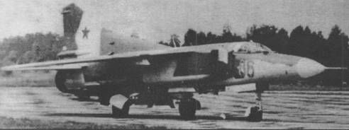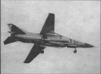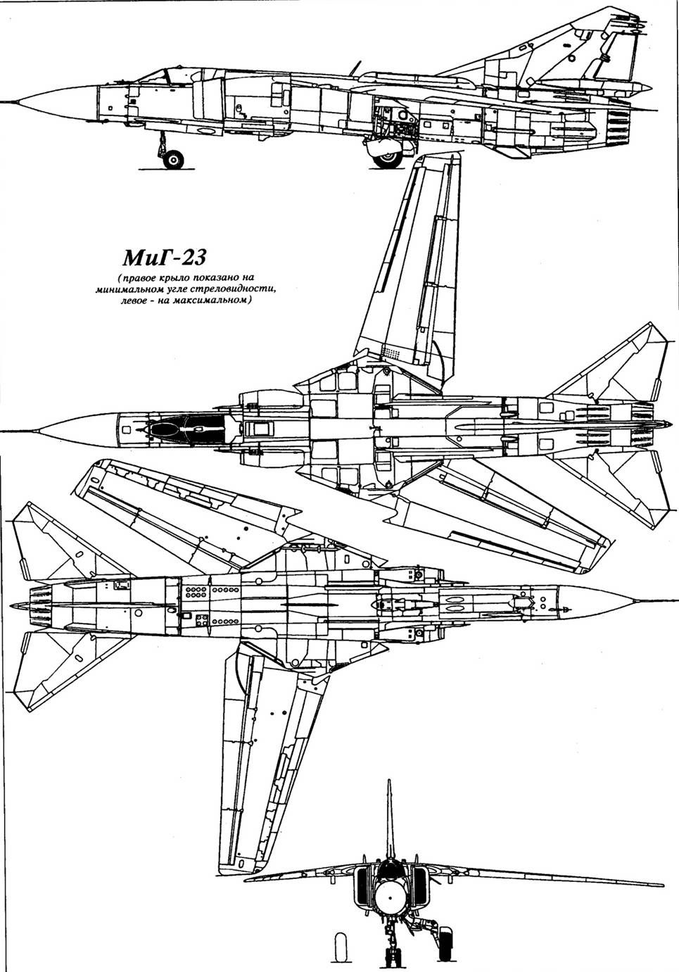 Завершил эволюция самолетов семейства МиГ-23 фронтовой истребитель МиГ-23 МЛД, созданный в 1984 г. и способный совершать полет на больших ушах атаки, что увеличивало маневренные характеристики. На самолете был уменьшен «боевой» угол стреловидности (технология изготовления отъемных мастей крыла была полностью отработана, было выяснено что, консоли даже на уменьшенном угле стреловидности, могут «держать» эксплуатационную перегрузку 8,5 g), в корневой части крыла был сделан вихреобра-зующий «запил», а на ПВД появились вихреобразующие пластины. В вариант МиГ-23МЛД до 1985 г. было переоборудовано большое количество самолетов МиГ-23 других модификаций. Серийное производство истребителей МиГ-23 прекращено в 1985 г. На ММЗ «Знамя труда» выпущено 4278 самолетов (включая и истребителъно-сюмбардировочные модификации), в Иркутске построено 769 УТС МиГ-23уБ (с учетом переоборудования в вариант МиГ-23уМ -1020 самолетов). В настоящее время истребители МиГ-23 последних модификаций ВВС России выведены в резерв и находятся на базах хранения. Кроме ВВС и войск ПВО СССР самолеты МиГ-23 различных модификаций поставлялись ВВС Афганистана, Алжира, Анголы, Болгарии, Кубы, Чехословакии, Германии, Египта, Ливии, Венгрии, Ирака, Индии, КНДР, Эфиопии, Южного Йемена, Польши, Сирии, Вьетнама. В начале 1990-х годов ОКБ им. А.И. Микояна предложило вариант модернизации самолета МиГ-23, предусматривающий установку системы вооружения от самолета МиГ-29: БРЛС «Рубин-29», ракеты класса «воздух-воздух» средней дальности Р-27 и УР малой дальности Р-73, а также на-шлемный ггрицел-целеуказатель. Возможно применение на модернизируемых истребителях и более совершенной системы вооружения. ОСОБЕННОСТИ КОНСТРУКЦИИ МиГ-23 - один из первых серийных самолетов с изменяемой геометрией крыла. Планер изготовлен из стали и алюминиевых сплавов с широким использованием сварки. Консоли крыла имеют трапециевидную в плане форму и могут устанавливаться на угол стрелдовидности 16, 45 и 72° по передней кромке. Каждая консоль имеет прекрылки, четырехсекционные закрылки и двухсекционные интерцеп-торы. На самолете МиГ-23МЛД «боевой» угол стреловидности уменьшен с 45 до 33°. При достижении определенного угла атаки в диапазоне углов стреловидности 16- 33° носок крыла стал отклоняться автоматически (при скорости до 900 км/ ч (М‹0 ,9) и угле атаки более 10° носок отклонялся на 20°). Подфюзеляжный гребень МиГ-23 выполнен отклоняемым, при выпуске шасси его нижняя часть устанавливается в горизонтальное положение. Тормозной парашют площадью 21 м 2 размещен в основании киля. СИЛОВАЯ УСТАНОВКА. Самолет оснащен одним ТРДФ Р-27Ф2М-300 (1 х 10.000 кгс - МиГ-23С МиГ-23УБ), Р-29-300 (1 х 12.500 кгс - МиГ-23М, МиГ-23МС, МиГ-23МФ), Р-35-300 или Р-35Ф-300 (1 х 13.000 кгс - МиГ23МЛ, МиГ-23 МЛА, МиГ-23П и МиГ-23МЛД). ВООРУЖЕНИЕ. Имеются пушка ГШ-23Л (23 мм, 200 патронов), УР средней дальности Р-23Р и Р-24Р (МиГ-23МЛА и МиГ-23МДЦ) с радиолсжационной полу активной системой наведения, Р-23Т и Р-24Т (МиГ-23МЛА и МиГ-23МЛД) с ТГС; две-четыре УР малой дальности Р-13М, Р-ЗР или Р-ЗС с радиолокационной полуактивной системой наведения или ТГС, четыре-шесть УР ближнего боя Р-60 и Р-60М. В ходе модернизации возможна установка ракет Р-73 с целеуказанием от на-шлемного визира. Для поражения наземных целей самолет может оснащаться двумя УР Х-66 или Х-23, НАР различных типов, свободнопадаюши ми бомбами калибром до 500 кг общей массой до 2000 кг