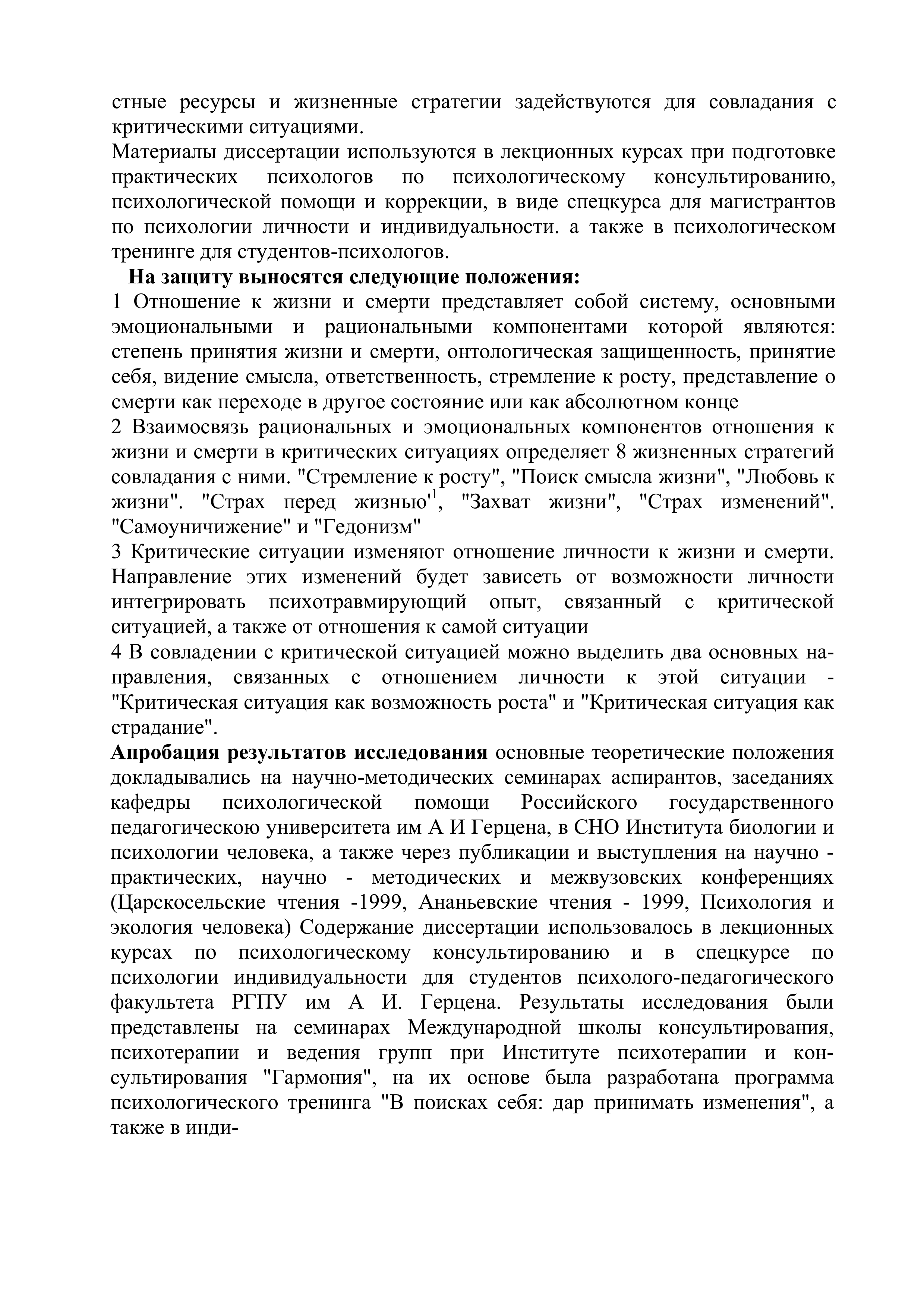 "Отношение к жизни и смерти в критических жизненных ситуациях(Автореферат)" - читать интересную книгу автора