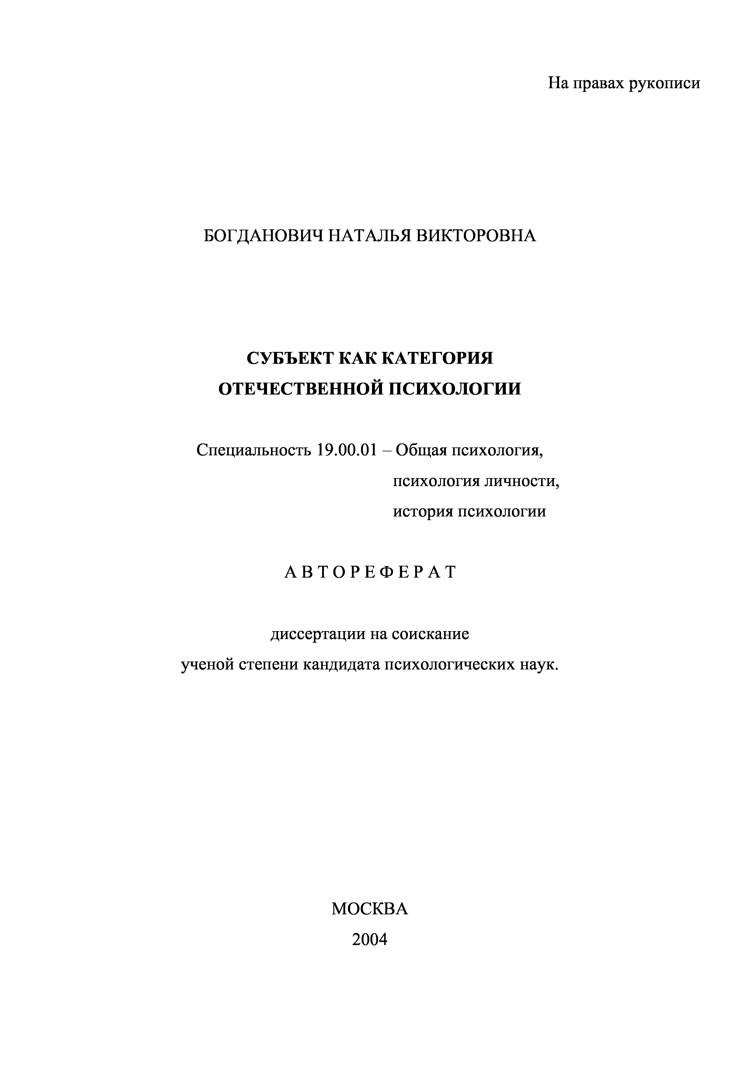 "Субъект как категория отечественной психологии(Автореферат)" - читать интересную книгу автора (Богданович Н.В.)