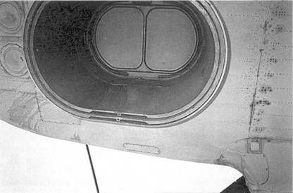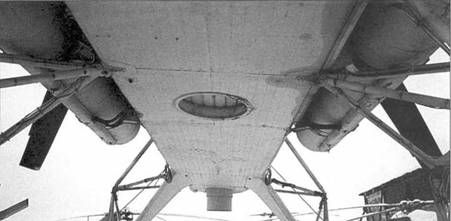 Шахта аварийного покидания в сложенном положении (вид снизу) В декабре 1961 г. вертолет предъявили на Государственные совместные испытания (ГИ). Однако он к ним допущен не был, т.к. заказчик потребовал увеличить ресурс двигателей и редуктора, оснастить Ми-10 новыми лопастями несущего винта* и передними опорами шасси с обтекателями. После внесения этих изменений в конструкцию, пришлось проводить дополнительные заводские испытания Ми-10, и 1-й этап ГИ удалось начать лишь через год. Вертолет поступил в ГК НИИ ВВС, где для работы с ним была назначена бригада во главе с ведущим инженером С.Х.Атабеняном. В ее состав также вошли: ведущий летчик А.Г.Солодовников, борттехник В.Д.Пирогов, второй летчик Н.В.Разомазов, помощник ведущего инженера В.А.Ермолаев. В ходе ГИ отрабатывалась перевозка различных грузов с использованием всего арсенала специальных средств Ми-10. Так, проводилась транспортировка на платформе автомобилей, автобусов, автоцистерн, заезжавших на нее своим ходом. Перевозились также железнодорожные контейнеры и другие несамоходные объекты, которые затаскивались бортовой лебедкой. Крупногабаритные грузы создавали существенное аэродинамическое сопротивление в полете. Наиболее заметным его источником стал «домик геологов», имевший ответные узлы под гидрозахваты и транспортировавшийся без грузовой платформы. На заключительном этапе ГИ состоялись посадки на режиме самовращения несущего винта. Испытания велись очень интенсивно и в основном завершились в начале 1964 г. -раньше установленного срока, В целом, по результатам ГИ Ми-10 получил положительную оценку. Была подтверждена его способность перевозить грузы массой до 15 т, с габаритами 20x3.5x5 м (при крестообразной форме груза шириною до Юм) как на гидрозахватах, так и на платформе. Однако испытатели выявили и ряд недостатков вертолета. Основной проблемой стал высокий уровень вибрации, особенно проявлявшийся на малых скоростях. Высказывались и другие претензии. В частности, выяснилось, что по установленному в кабине «телевизору» хорошо наблюдать лишь за раскачкой груза в полете при транспортировке его на тросовой подвеске. А вот во время работы с грузами на висении и земле он малоэффективен, поэтому, чтобы видеть под вертолетом хоть что-то, летчику приходится высовываться из форточки едва ли не по пояс. Благодаря высокому шасси, кабина экипажа оказалась на уровне третьего этажа, откуда открывался великолепный обзор. Однако при взлете и посадке по-самолетному вертолет угрожающе раскачивался на своих «ходулях». Подвеска грузов на гидрозахватах оказалась весьма неудобной операцией и требовала значительного времени. Не вызвала энтузиазма у военных и необходимость оснастить широкую номенклатуру техники, спецконтейнеров и т.п. ответными узлами под них. Летом 1965 г. на милевской фирме прошло совещание работников КБ и представителей ГК НИИ ВВС, на котором обсуждались итоги испытаний и пути совершенствования Ми-10. Выработанные мероприятия стали основой программы доводки вертолета, выполнение которой растянулось до 1967 г, За этот период многие проблемы были решены. В частности, отказались от одновременной установки лебедки и гидроподъемников одинаковой грузоподъемности, что позволило повысить весовую отдачу Ми-10. Однако полностью одолеть главный недостаток вертолета - высокую 