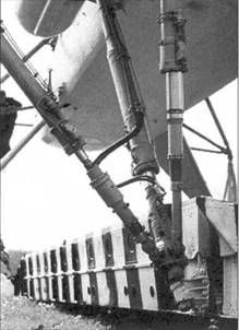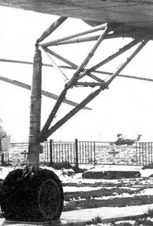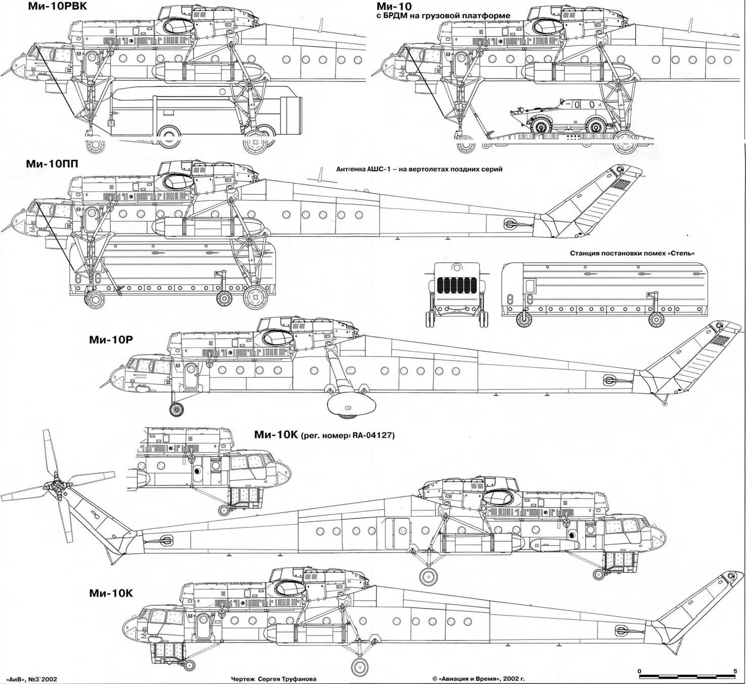 Топливный бак и задние опоры шасси серийного Ми-10К В 1970 г. начались полеты на летающей лаборатории Ми-10, оснащенной форсированными двигателями Д-25ВФ мощностью 6500 л.с, усиленной трансмиссией и новым оборудованием. Решение о серийном производстве Ми-10 было принято еще в 1961 г., но его развертывание все время откладывалось, и не только по техническим причинам. Значительное влияние на это оказало постепенное снижение интереса к ра-кетно-вертолетным комплексам. И все же 5 марта 1964 г. строивший Ми-6 Ростовский завод №168* приступил к выпуску «десятки», получившей заводской индекс «изделие 60». Руководил предприятием в то время Д.М.Чумаченко. Первый серийный вертолет с заводским №4680101К построили за полгода. 10 сентября 1964 г. его поднял в воздух Калрелян. Постепенно темп выпуска увеличивался, хотя в целом оставался невысоким. В 1965 г. сборочный цех покинули две машины второй серии - 5680201К и 0202К, в 1966 г. -еще две третьей (0301К и 0302К) и три четвертой (0401 К, 0402К и 0403К). В 1967 г. завод, построив машины 0404К и 0405К, завершил выпуск четвертой серии и начал пятую. В 1968 г, со стапелей сошли «десятки» шестой серии, а в 1969 г. - седьмой, самой многочисленной. Практически в каждой серии вносились незначительные изменения в конструкцию. Например, начиная с вертолета №66800402 для облегчения покидания борта в аварийных ситуациях были внедрены сбрасываемые двери.- * Заводские номера Ми-10 можно без особого труда расшифровывать. Например, №4680101К означает: 4 - год выпуска (1964); 68 - две последние цифры номера завода; 01 - номер серии; 01 - номер машины в серии; К - кран. Эта буква появилась для облегчения работы с технической документацией на предприятии, которое одновременно выпускало Ми-6 и Ми-10. Впоследствии она вызвала определенную путаницу при указании типа вертолета даже специализированными авиационными изданиями. Так, Д.Гри-нюк в статье журнала «Крылья Родины» о музее Центра боевого применения авиации Сухопутных войск пишет: «Гигантский Ми-10К на высоком шасси…» . Выпуск Ми-10К начался в Ростове 23 марта 1974 г. В процессе подготовки к нему была доработана система управления вертолета и увеличена подвесная кабина, а в следующем году на Ми-10К внедрили системы гашения вибраций и колебаний груза на внешней подвеске. На вертолетах с серийными №№ 04121 - 04135 не устанавливались обтекатели килевых балок, а некоторые из них оснащались керосиновыми обогревателями КО-50, которые монтировались по правому борту. В 1977 г. один из авторов - тогда студент ХАИ, проходя со своими однокурсниками практику на Ростовском заводе, застал в сборочном цехе один из последних выпущенных «летающих кранов». Нам удалось осмотреть машину и даже оценить «удобство» перехода из основной кабины в подвесную. В то время практически вся производственная оснастка «десятки» была демонтирована и складирована в цехах. На летно-испытательной станции находился один Ми-10, за полетами которого нам посчастливилось наблюдать. По данным МВЗ, всего в Ростове выпустили 55 вертолетов Ми-10 различных модификаций. По документам «Роствер-тола», Ми-10К было построено 17 экземпляров (в 1976 г. сдали 7 и в 1977 г. - 10). Известно также, что ростовчане переделали два «длинноногих» вертолета в «кашки», еще 3-4 «десятки» передали МВЗ для создания на их базе опытных машин и 20 переоборудовали в постановщики помех. «Лишний» вертолет В отличие от наших дней, во врем