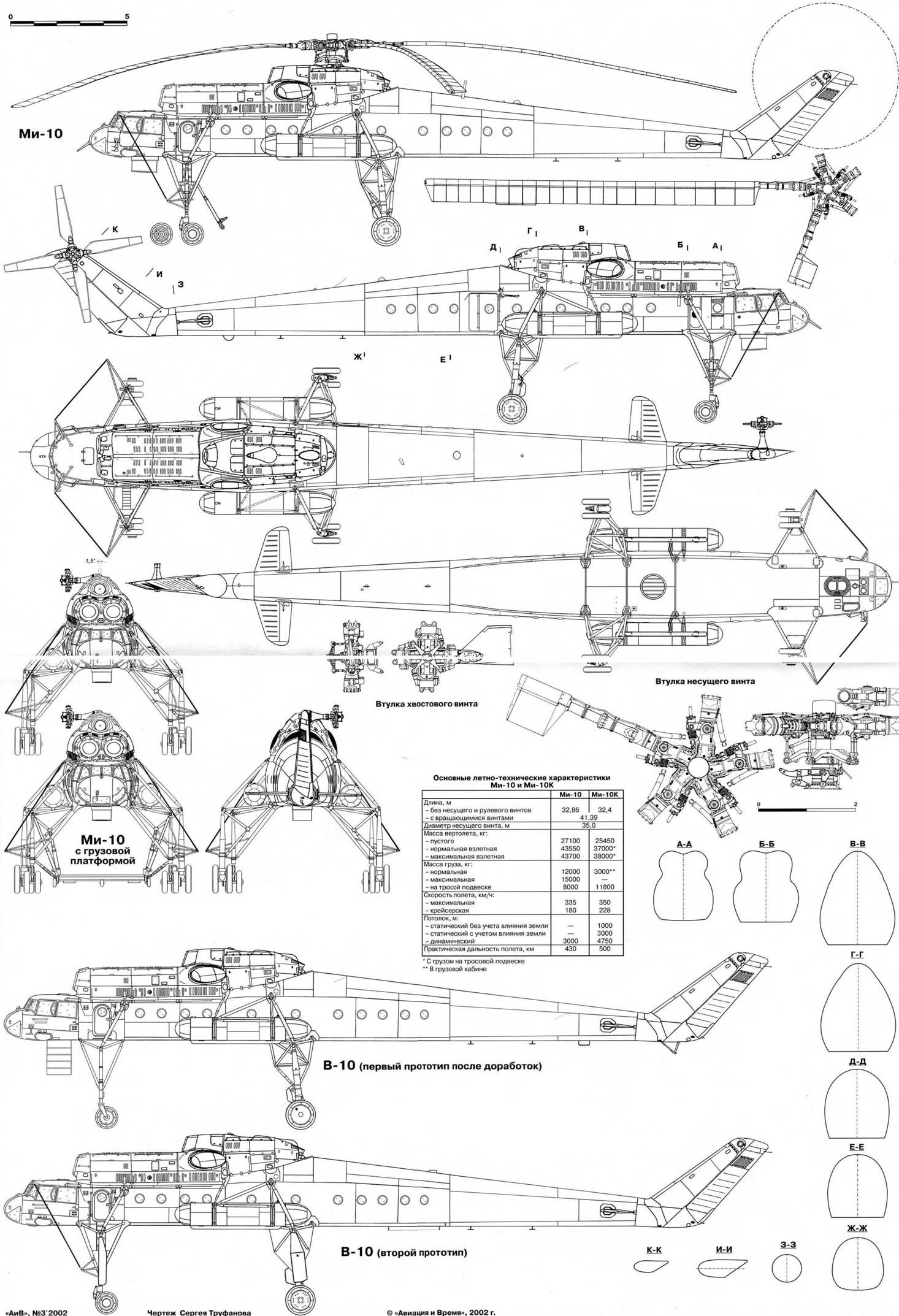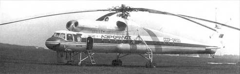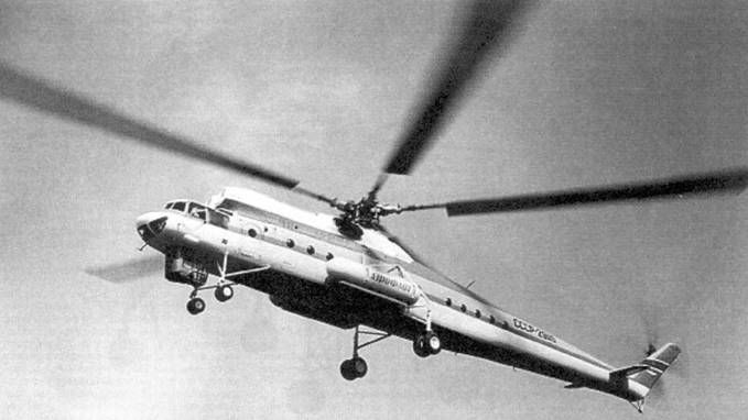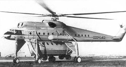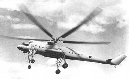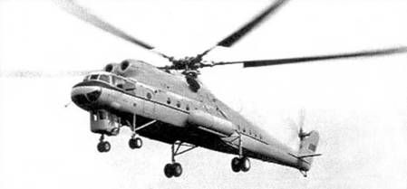 Экипаж - три человека: левый летчик (командир), летчик-штурман и борттехник. На Ми-10К - четыре человека: два пилота, пилот-оператор (при проведении краново-монтажных работ) и бортинженер. Фюзеляж - цельнометаллический полумонокок переменного сечения, с плоской нижней частью. Состоит из носовой, центральной частей, хвостовой и концевой балок. Носовая часть вмещает кабину экипажа. В ее полу находится люк для аварийного покидания, закрытый створками и панелями, сбрасываемыми при помощи ручки и специального механизма. На Ми-10К в этом месте находится переходной люк а подвесную кабину. Центральная часть фюзеляжа развернута вправо относительно строительной вертикали вертолета на Г 30' и включает входной тамбур и грузовую кабину. На левом борту между шп.№№2 и 4 расположена входная дверь, в стенке шп.№5 - дверь для перехода из тамбура е грузовую кабину, на правом борту между шп, №№ 22 и 25 - задняя двухстворчатая дверь, в стенке шп.№ 35 -дверь для выхода а хвостовую балку, в силовом полу между шп.№№ 15 и 17 - круглый люк диаметром 1000 мм для внешней подвески грузов. Грузовая кабина имеет длину 14040 мм. Между шп. №№6 и 28 по бортам предусмотрена установка съемных откидных сидений на 28 человек: по правому борту - три трехместных и четыре одноместных, по левому - четыре трехместных и три одноместных. Над потолком центральной части фюзеляжа размещены двигательный и редуктор-ные отсеки, а также контейнер расходного топливного бака. Для осмотра редуктора и двигателей в потолке сделаны два люка. Хвостовая балка состоит из набора шпангоутов, стрингеров и работающей обшивки. Внутри, вдоль верхней части балки, проходят хвостовой вал трансмиссии, а также тросы управления стабилизатором и хвостовым винтом. Между шп. №№15 и 16 установлены узлы крепления стабилизатора и сделаны вырезы под его лонжерон. Для прохода внутри балки имеется настил из листового дюралюминия. Хвостовая балка соединяется с центральной частью фюзеляжа по стыковочным шпангоутам при помощи 71 стального болта. Концевая балка состоит из трех частей: килевой балки, фиксированного руля и сьемного обтекателя. К ее шп.№7 крепится промежуточный редуктор. Для подхода к нему в стенке лонжерона килевой балки имеется овальное отверстие. Фиксированный руль несимметричного профиля, дюралюминиевый со стороны хвостового винта и с полотняной обшивкой с противоположной стороны. В верхней часта с левой стороны имеются «жабры» для подачи воздуха, охлаждающего промежуточный редуктор. Несущий винт (НВ) состоит из втулки и пяти лопастей. Благодаря шарнирным соединениям лопастей с корпусом втулки обеспечивается возможность махового движения их относительно горизонтальных шарниров, колебательного движения в плоскости вращения относительно вертикальных шарниров, а также поворот лопастей вокруг осевых шарниров. Колебания лопастей в плоскости вращения винта гасятся гидравлическими демпферами. Для повышения устойчивости движения лопастей и улучшения характеристик вертолета втулка имеет «компенсатор взмаха». Лопасть НВ - цельнометаллическая, со стальным трубчатым лонжероном, на котором крепится 21 отсек, не имеющий жесткой связи между собой. Хвостовые части отсеков выполнены с сотовым заполнителем. Лопасть прямоугольная в плане. Хорда - 1000 мм. Лопасть имеет геометрическую крутку, изменяющуюся по линейно