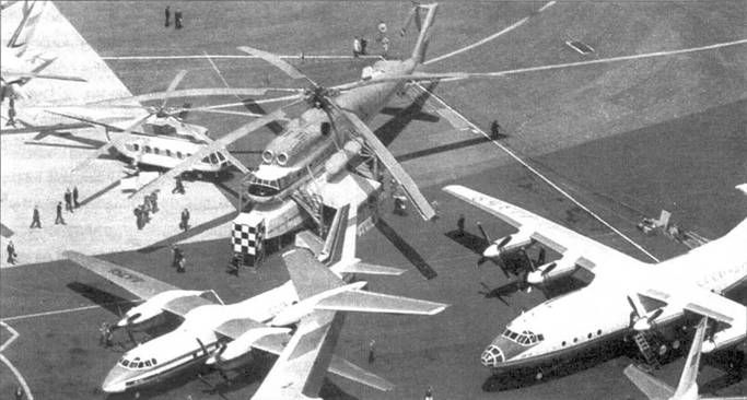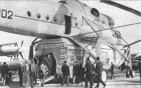 Посетители салона заходят в кинопавильон, доставленный Ми-10