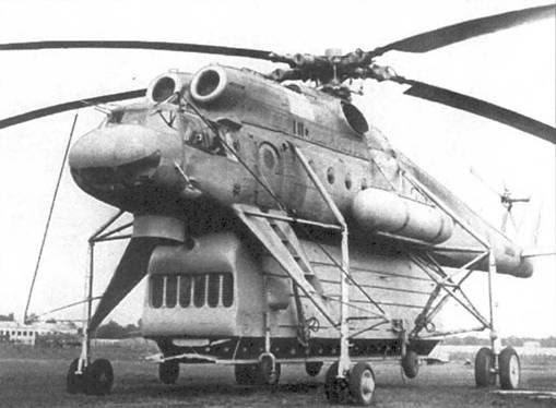 Второй опытный Ми-10 в Амстердаме. 1966 г. 14 января 1965 г. совершил первый полет специально подготовленный для установления мировых рекордов вертолет Ми-10Р. Он был максимально облегчен и оснащен доработаным шасси от Ми-6 с обтекателями основных стоек, а также хвостовой опорой со сдвоенными колесами. 26 мая экипаж В.Колошенко установил на этом вертолете первое достижение, подняв 5-тонный груз на высоту 7151 м. 28 мая экипаж ПВ.Алферова на этой машине установил сенсационный абсолютный рекорд грузоподъемности, подняв 25105 кг на 2840 м. В качестве основного груза использовали специально изготовленную металлическую болванку, которую закрепили под фюзеляжем. В общей сложности на Ми-10 и Ми- ЮР удалось установить 8 рекордов. В 1965 г. проводились испытания Ми-10РВК, который стал единственным ракетно-вертолетным комплексом, включавшем Ми-10 и доведенным до летного состояния. На внешней подвеске транспортировалась пусковая установка 9П116 с крылатой ракетой 4К95. Взлетная масса всего РВК достигла 44,6 т, при массе пусковой - 12 т. После посадки система подготавливалась к пуску за 5 мин. Дальность стрельбы составляла 200 км. В связи со снятием ракет 4К95 с вооружения работы по Ми-10РВК прекратились в том же году. Милевцы хорошо понимали, что конструкция Ми -10 не оптимальна для - летающего крана», основным эксплуатантом которого должен был стать Аэрофлот. Учитывая выработанные ГосНИИ ГА требования, ОКБ в 1964 г. приступило к разработке «коротконогой» модификации. Это позволяло рассчитывать на повышение экономических характеристик машины при незначительных затратах на ее создание. Конструкторы использовали опыт применения Ми-4 и Ми-6 на строительно-монтажных работах. Существенным недостатком этих машин являлось то, что летчики не могли со своих рабочих мест видеть подвешенный груз и место его установки. Поэтому один из членов экипажа выполнял обязанности оператора: расположившись у входной двери или центрального люка, он подавал сигналы своему командиру. После установки детали приходилось сбрасывать тросовую подвеску, что не исключало повреждения ее самой и возводимой конструкции. Достаточно трудоемкой операцией получалась доставка и повторная подцепка подвески на вертолет. Внимательно отнеслись милевцы к достижениям американцев, внедренным на S-64A. Весовая отдача этой машины достигала почти 50%, а в ее кабине находилось развернутое в сторону груза место летчика-оператора, с которого был обеспечен прекрасный обзор.