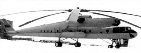 Использование на В-10 динамической системы Ми-6 и его силовой установки с точки зрения достижения максимальной весовой отдачи оказалось неоптимальным. Еще больше ухудшили ситуацию фюзеляж и тяжелое шасси. Поэтому если американцы на S-60 добились увеличения грузоподъемности на 25% относительно базового S-56, то милевцы надеялись на 10, максимум 20%. Первоначально предполагалось зацеплять груз, находившийся под вертолетом, подтягивать его с помощью лебедки к фюзеляжу и фиксировать расчалками между опорами шасси. Для этого внутри фюзеляжа в зоне редукторного отсека к силовым шпангоутам крепилась ферма с грузовой лебедкой ЛПГ-7 и восьмикратным полиспастом, обеспечивающим подъем и опускание грузов. Управлять гидрозахватами можно было из кабины пилотов и с земли с помощью переносного пульта. Когда поступило задание обеспечить перевозку крылатых ракет, конструкторы решили установить, кроме лебедки, дистанционно управляемые гидроподъемники, позволявшие поднимать с земли контейнеры и технику массой до 12 т, оборудованные четырьмя ответными узлами. Для перевозки грузов и техники, таковых не имевших, предусматривалась подвеска на гидрозахватах между опорами шасси специальной унифицированной платформы размерами 8,5x3,6 м, весившей 1340 кг. Она оснащалась лебедкой ЛПГ-3, съемными трапами для въезда колесной и гусеничной техники, в незагруженном состоянии ее можно было перемещать по аэродрому на своих колесах. Для обеспечения аварийного покидания вертолета при полете с платформой под кабиной экипажа решили установить раздвижную телескопическую шахту. В-10 также оснастили применяемым на Ми-6 узлом внешней тросовой подвески грузоподъемностью 8 т. Чтобы пилоты со своих рабочих мест могли видеть груз, вертолет снабдили телевизионной установкой, камеру которой разместили под фюзеляжем, а монитор - над приборной доской летчиков. Особенности конструкции В-10 грозили возникновением земного резонанса. И только большой опыт, накопленный при создании Ми-4 и Ми-6, позволил ми-левцам решить эту сложнейшую задачу. Благодаря использованию агрегатов Ми-6 проектирование завершилось в 1959 г. К лету следующего года был построен первый прототип вертолета (заводской №04101). Перед началом летных испытаний машина получила обозначение Ми-10. На ней отсутствовала шахта аварийного покидания, а на всех стойках шасси стояло по одному колесу, причем передние колеса были самоориентирующиеся. 15 июня 1960 г. Ми-10 впервые поднялся в воздух под управлением ведущего л етч и ка - исп ытател я фирмы Р. И. Капреляна. В дальнейшем во время заводских испытаний вертолет пилотировали, в основном, Г В.Алферов и Б.В.Земсков. Испытания проходили успешно. Уже в четвертом полете Ми-10 отправился в перелет протяженностью 3000 км, который благополучно завершил, выполнив несколько посадок для дозаправки. Милев-ские летчики выяснили возможности вертолета по перевозке различной техники, а для определения его ЛТХ при транспортировке на платформе крупногабаритных грузов выполнили полеты со специальным контейнером. Параллельно в ЦАГИ на третьем экземпляре Ми-10 (№ 04103) проводились статиспытания. К сожалению, в мае 1961 г. при перелете из Казани в Москву машина 04101 потерпела катастрофу. Когда вертолет находился в районе г.Сасово, экипаж обнаружил падение давления масла в главном редукторе, и командир ле