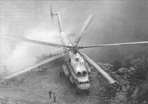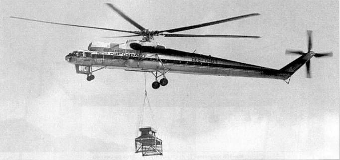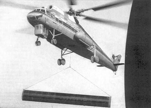С каких только площадок ни приходилось работать Ми-10К Своего рода прологом к эксплуатации Ми-10К в подразделениях Аэрофлота стали работы, выполненные летчиками МВЗ и Гос-НИИ ГА на опытной и первых серийных машинах. О некоторых уже упоминалось выше, среди других выделим «археологическую» миссию экипажа В.П.Колошенко, который вытащил из болота Нивий мох под Новгородом обнаруженный местными поисковиками Ил-2, сбитый в годы Великой Отечественной войны. После реставрации этот штурмовик был установлен на территории ильюшинской фирмы. В Аэрофлот Ми-10К стали поступать в середине 1970-х гг. Они использовались только тремя летными отрядами: 223-м, расположенным в Ухте (Коми АССР), 255-м. находившимся в Тюмени, и подразделением из подмосковного Мячиково. Большинство выпущенных «летающих кранов» распределили между ухтинцами и сибиряками (примерно по 7-8 машин). Кроме того, как минимум один такой вертолет попал в краснодарский ВНИИ ПАНХ. По свидетельству длительное время работавшего в Ухте В.Митина, среди всех имевшихся там милевских машин «десятка» выделялась особой трудностью в эксплуатации. Вибрация колотила Ми-10К, в полете иногда вываливались приборные доски, лопались шпангоуты, проваливался гидроблок. Порой казалось, что довести машину до «ума» не удастся. Однако благодаря хорошему взаимодействию МВЗ, ростовского завода и эксплуатантов, вертолет довольно быстро превратился в достаточно надежный «воздушный кран». И хотя в крейсерском полете вибрация оставалась значительной, на висении ее уровень был существенно снижен, что позволило очень успешно использовать Ми-10К на различных стройках. Например, в 1975-80 гг. ухтинские экипажи провели более 50 сложных монтажей с экономическим эффектом свыше 1 млн. руб. Среди выполненных ими работ выделялись установка 70-м ретрансляционной вышки на маршруте газопровода Надым-Ухта и опор ЛЭП-500 при прокладке линии через Волгу в районе Костромы. В тот же период тюменские авиаторы приняли участие в реконструкции старых уральских заводов, где провели ряд буквально ювелирных операций. Так, экипаж Н.Бабинцева и наземная бригада монтажников установили на заводе по ремонту горно-металлургического оборудования в Верхних Уфалях двенадцать наддуваемых вентиляционных шахт, каждая из которых весила около 10 т. Конструкции высотой с трехэтажный дом устанавливались в давно построенные производственные корпуса, впритык к действующему технологическому оборудованию. При этом 7 шахт вертолетчики доставили внутрь цехов, для чего пришлось использовать длинные 35-метровые тросы.