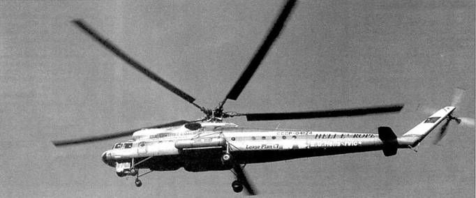 Замена хвостового винта на Ми-10К из 255-го отряда На счету экипажей «десяток» были и вовсе уникальные достижения. В 1980 г. ухтинское подразделение «летающих кранов», которым руководил очень известный пилот лауреат Государственной премии СССР Т.Мальцев, впервые в мировой практике применило одновременно два вертолета для монтажа тяжелых металлоконструкций. Собранная на земле и закрепленная на поворотных узлах 100-м ретрансляционная мачта, весившая 40 т, затем была поднята в вертикальное положение двумя Ми-10К. В следующем году аналогичную работу провели в Тюменской области. По оценкам ГосНИИ ГА, себестоимость монтажных работ с применением Ми-10К оказалась в 1,5 раза ниже, чем с использованием Ми-б. Увеличению эффективности «десятки» способствовало внедрение передовых технологий и различных приспособлений. Так, уже в начале 1980-х гг. арсенал дополнительных средств для работы с внешней подвеской пополнился «крюком-самозахватом», позволявшим подцеплять груз без помощи такелажников, «ловителем» для безлюдного монтажа, системой азимутальной ориентации груза. Однако «десятка» давала возможность не только добиться впечатляющего экономического эффекта - в историю вертолета вошли операции, благодаря которым удалось сохранить памятники культуры и техники, а также уникальные природные комплексы. Например, когда было принято решение возвести телевышку на одной из вершин Ильменского хребта (недалеко от Миаса), под угрозой уничтожения оказались гектары реликтового леса местного заповедника. Для решения задачи традиционными способами требовалась прокладка дороги, вырубка большой площадки под наземную сборку конструкций, взрывные работы. Собрать вышку без столь варварских технологий позволил Ми-10К, которым мастерски управлял тюменский экипаж во главе с А.Марченко. Несмотря на врожденные недостатки, «десятка» прекрасно подходила для огромных территорий СССР. Небольшой парк вертолетов успешно справлялся с многочисленными заявками, поступавшими из различных регионов страны. Приличная перегоночная дальность, хорошее навигационное оборудование позволяли быстро перебрасывать машины с одной стройки на другую, выполняя перелеты днем и ночью. На газетных и журнальных полосах то и дело появлялись сообщения об очередном «деянии» Ми-10К. То в Челябинске на крыше гостиницы установлен здоровенный рекламный экран, то в Харькове и Минске смонтированы телевышки, то со 150-метровой трубы ТЭЦ в Бирюлеве снят технологический кран. Надо сказать, что далекие путешествия были выгодны отрядам, так как при плановой социалистической экономике зарплата зависела не столько от количества и качества выполненной работы, сколько от проведенных в воздухе часов. С распадом СССР развалилась и когда-то самая большая в мире авиакомпания Аэрофлот. Ее региональные подразделения стали превращаться в самостоятельные предприятия, и у «десяток» появились новые владельцы. На месте 223-го и 255-го отрядов возникли авиакомпании «Комиавиатранс» и «Тюменьавиатранс». Чтобы выжить в сложных условиях, технику стали сдавать в аренду. Так, в 1992 г. тюменский Ми-10К оказался в распоряжении компании Skytech, штаб-квартира которой расположена в Брюсселе. Обзавелась «летающим краном» и российская фирма «Взлет», созданная при НПО ГосНИИ «Аэронавигация». В последние 10 лет в биографию М