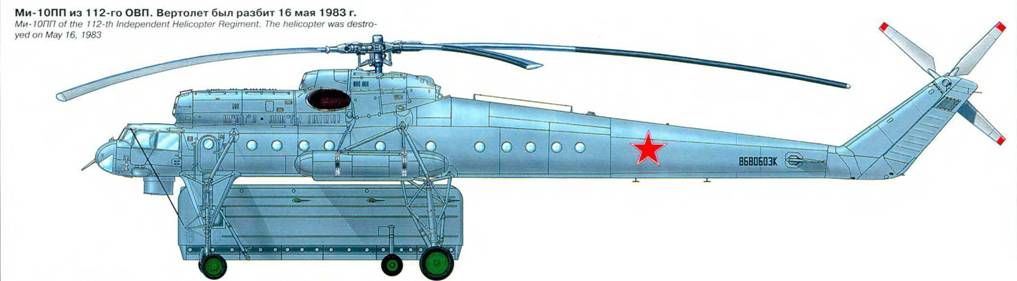 Ми-10 из Северной группы войск. Польша, аэродром Легница, конец 1960-х гг. Основной задачей Ми-10 считалась перевозка грузов, не помещавшихся в Ми-6. В процессе боевой подготовки, в том числе на крупномасштабных учениях, экипажи отрабатывали транспортировку с помощью платформ различных образцов техники: грузовых автомобилей, ра-ведывательно-дозорных машин, бронетранспортеров, передвижных радиостанций и т.п. Иногда «десятки» привлекались для оказания помощи местным гражданским властям. Например, экипажи 112-го ОВП занимались перевозкой опор ЛЭП. Осталось в истории Ми-10 и участие в реальных боевых действиях, выпавшее на долю вертолетов 181-го ОВП. В январе 1980 г. эта часть была переброшена из Джамбула в Афганистан, где основной ее базой стал Кундуз. По материалам, предоставленным В.Д.Паевским, отряд «десяток» остался в Союзе, и лишь весной одна машина пополнила состав воюющего полка. Возглавлял экипаж командир отряда к-н Кузнецов. Вертолет использовался, прежде всего, для перевозки крупногабаритных грузов. К сожалению, служба его оказалась недолгой. Летом того же года, во время рейса Кундуз-Маймане, Ми-10 потерпел катастрофу. В том полете перевозили на платформе автозаправщик МАЗ-500ТЗ, который сопровождал солдат-водитель, находившийся в грузовой кабине «десятки». Вертолет удалился от Кундуза всего на 20 км, когда отказал один двигатель. Экипаж сбросил платформу и попытался совершить аварийную посадку по-самолетному на подвернувшуюся площадку. Она оказалась усеянной валунами, покрытой ямами и промоинами, что для «длинноногого» Ми-10 стало роковым обстоятельством. Влетев в одну из промоин, вертолет сломал передние стойки шасси,скапотировал, разрушился и сгорел. Еще во время касания земли из него выпрыгнули летчик-штурман и солдат, но они, как и остальные члены экипажа, погибли. Точную причину отказа двигателя установить не удалось, хотя высказывалась версия о попадании в него пули из ДШК. Ему на замену из Джамбула прибыла вторая «десятка». По воспоминаниям бывшего главного инженера по вертолету и двигателю 73-й Воздушной армии п-ка Ю.М.Гнилицкого, этот Ми-10 находился в Афганистане дольше предшественника и был возвращен в Союз после трагического инцидента. Не позднее 1984 г. в одном из полетов машина была обстреляна снайперами. Прямым попаданием из «бура» был убит борттехник. Некоторые элементы оборудования вертолета получили повреждения. Его перегнали в Джамбул, где устранили все неисправности. В целом Ми-10 оказался в ВВС «лишней» машиной. Об основном его предназначении, столь сильно повлиявшем на конструкцию, вскоре почти забыли. Узкая специализация, отличавшиеся от Ми-6 летно-технические характеристики, очень маленький парк требовали выработки особой тактики применения и ставили под сомнение боевую ценность «десятки». И все же в 1970-е гг. для вертолета нашлось достойное занятие - он освоил очень важную специальность постановщика радиопомех. Начинка контейнера «Степь» включала типовые советские авиационные станции РЭБ, которые хоть и отличались капризным нравом, но при высоком уровне подготовки наземного и летного персонала позволяли эффективно решать поставленные задачи. Постепенно транспортные машины стали отправлять в Ростов и Конотоп, откуда они возвращались в всйска уже в новом качестве и с новым обозначением Ми-10ПП. При этом в