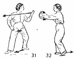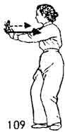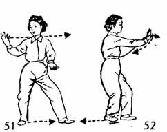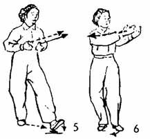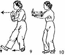 5. Правая ладонь, направленная вверх, на уровне плеча делает полукруг направо и назад; левая рука тоже следует за поворотом правой руки. Поворот делается так, чтобы обе ладони развернулись наружу, левая рука ложится на запястье правой и выталкивает ее вперед, обе руки немного согнуты: когда обе руки ведутся назад, носок правой ноги поднимается и поворачивается наружу; две руки выталкиваются вперед, делается шаг вперед правой ногой; затем носок постепенно опускается на землю; левая нога следует за правой и становится чуть позади нее; носок левой ноги следует по земле (где-то на два — три цуня позади правой ноги), взгляд устремлен на правую руку, немного замереть, приостановив движение. Все, от начала, до конца, всед движения выполняются Единым Духом (И-Ци ); нельзя прерывать дыхание (рис. 9, 10).