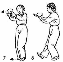 4. Затем обе руки, оставаясь на одном уровне, поворачиваются направо; тело тоже поворачивается вправо. При этом в момент поворота правая ладонь переворачивается вверх, а левая — вниз. Во время начала поворота руки левый носок поднимается и поворачивается направо, а пятка опирается на землю; одновременно правая пятка медленно выдвигается по земле вперед, взгляд направлен на правую руку (рис. 7, 8).