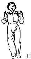 1. Продолжая предыдущее движение, приподнять носок правой ноги и повернуть налево, тело тоже поворачивается влево, одновременно ладони рук поворачиваются друг к другу и начинают раздвигаться, как будто держат надутый воздухом шар, который постепенно увеличивается в размере; руки доходят до уровня плеч, пальцы направлены вверх, руки находятся на расстоянии одного-двух цуней от плеч, все пальцы разжаты. Немного задержаться в таком положении (рис. 11).