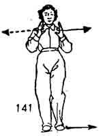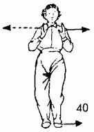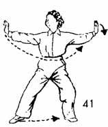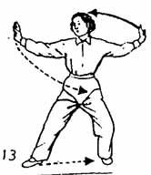 Запястья обеих рук разводятся в стороны, как будто держат длинный шест и доходят до уровня предплечий, ладони направлены наружу. Ладони держатся вертикально и находятся на уровне глаз, взгляд направлен на указательный палец правой руки, во время разведения рук левая нога делает шаг влево перпендикулярно правой ноге, и стопа ее косо опускается; ноги чуть согнуты. Немного задержаться в таком положении. В это время верхняя часть тела должна быть прямой, плечи расслаблены, дыхание свободное. Энергия-Ци должна быть опущена вниз, в живот. Но нельзя ее опускать вниз с помощью грубой силы (т. е. нельзя давить на нее), (рис. 13).