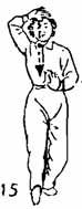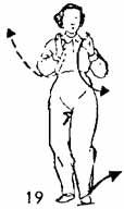 1. Левая рука ото лба начинает опускаться до уровня груди, локоть касается ребра, правая рука от живота поднимается вверх до уровня головы, тыльная часть касается лба; правая нога во время движения рук делает шаг вперед, пятка следует по земле. Расстояние между ногами не должно нарушать центр тяжести (рис. 15).
