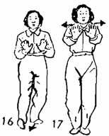 2. Затем правая рука по правой стороне лица опускается вниз, то приближаясь, то отдаляясь, локоть тоже должен опускаться прямо вниз. Когда правая рука доходит до уровня левой руки, обе руки выталкиваются вперед. Носок правой ноги еще до выпрямления рук опускается на землю, центр тяжести перемещается на правую ногу. Во время опускания носка правой ноги поднимается пятка левой ноги и делается шаг вперед; левая нога становится чуть сзади правой ноги. Носок левой ноги все время следует по земле, поясница расслаблена, предплечья округлены, взгляд направлен между ладонями (рис. 16, 17). Сделать маленькую задержку движения в таком положении.