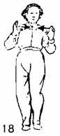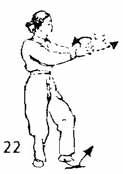 В продолжение предыдущего упражнения пальцы обеих рук выпрямить. Большой палец направлен вверх, правая нога делает шаг назад, носок правой ноги следует по земле. Шаг должен быть таким, чтобы не нарушался центр тяжести. Одновременно правая рука движется назад, а левая — вперед, левая рука — впереди, а правая — позади. Пальцы правой руки и запястье левой руки находятся на одном уровне, локти опущены вниз. Левая нога должна подтянуться к правой ноге, чтобы пятка находилась на расстоянии одного цуня, носок следует по земле (рис. 22).