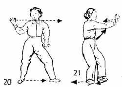 Продолжая предыдущее упражнение, левую руку опустить вправо вниз и от груди описать ею дугу влево до бедра. Большой и указательный пальцы разжаты, большой палец находится на расстоянии двух-трех цуней от бедра. Во время движения левой руки левая нога делает шаг влево, одновременно правая рука опускается вправо-вниз, ладонь разворачивается сердцем вверх и потом поднимается вправо-вверх. Большой палец правой руки и правое плечо должны быть на одном уровне. В это время пальцы должны проходить на уровне одного цуня ниже рта, руки немного изогнуты. Необходимо, чтобы запястья были расслаблены, правая нога, одновременно с выдвижением правой руки, делает шаг вперед, носок следует по земле, бедро опускается, взгляд направлен на пальцы правой руки (кончик указательного пальца), центр тяжести перемещается на левую ногу (рис. 20, 21).