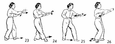 Теперь левую руку отвести по направлению к левым ребрам, ладонь поворачивается вниз. Одновременно ле вой ногой сделать шаг вперед; носок, направленный наружу, идет косо по земле. Ладонь правой руки направлена вверх и выдвигается вперед (выпрямляется); правая рука поворачивается ладонью вниз и затем начинает отводиться к правым ребрам. Одновременно делается шаг вперед правой ногой. Носок повернут наружу и следует по земле; правой рукой, сжав ее в кулак, над запястьем левой руки сделать удар вперед (кулак на уровне груди). Тыльная сторона левой руки направлена вверх и во время удара правой рукой тоже сжимается в кулак и возвращается назад к правым ребрам. Правой ногой во время удара правой руки сделать маленький шаг на расстояние двух-трех цуней от левой ноги. Немного остановиться, взгляд устремлен на указательный палец правой руки (рис. 23–26).