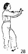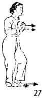 Теперь правую руку отвести назад, одновременно левую руку из-под предплечья правой руки выдвинуть вперед. Когда руки дойдут до одного уровня, поворачивают их ладонями наружу. Во время движения правой руки правая нога тоже отводится назад (но так, чтобы не нарушалось равновесие), а затем уже обе руки и левая нога вместе отводятся назад (левая нога должна быть впереди правой на расстоянии одного цуня, носок левой ноги следует по земле). Расстояние между большими пальцами не должно превышать одного цуня, две руки находятся впереди груди и легонько касаются ее (рис. 27).